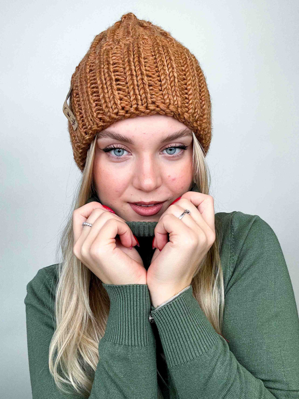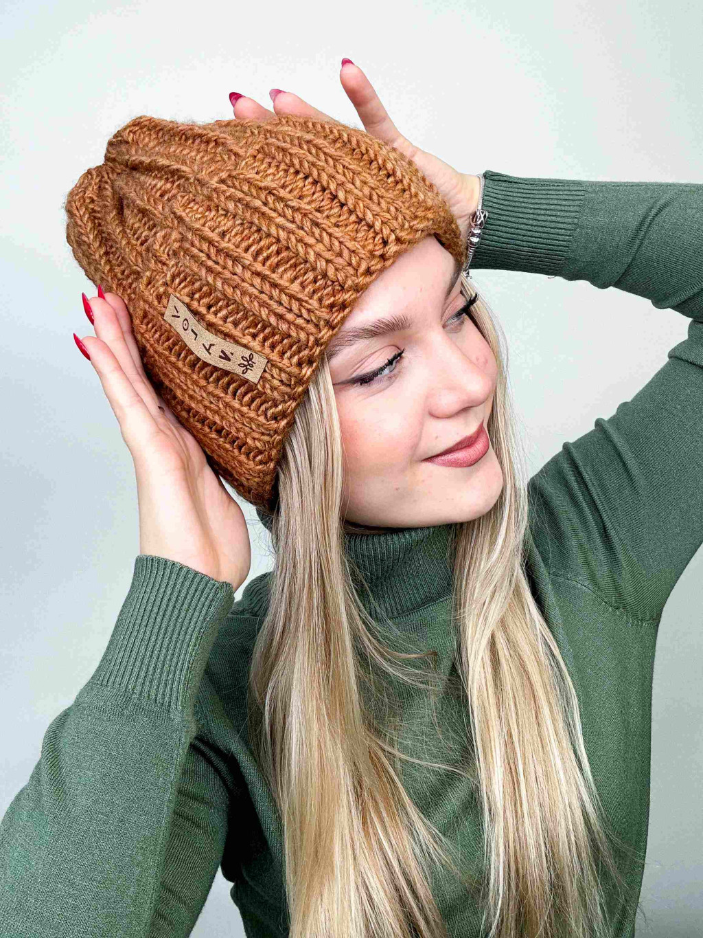 Trendy pletená čiapka s extra širokou manžetou zdobená koženým štítkom.