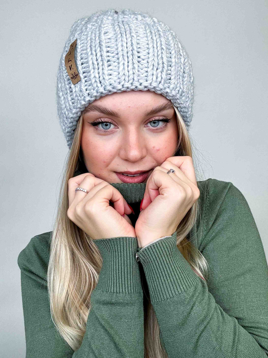 Trendy pletená čiapka s extra širokou manžetou zdobená koženým štítkom.