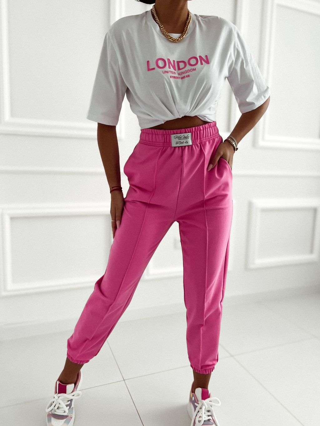 Oversize tričko s krátkym rukávom a nápisom. Teplákové nohavice voľného strihu s gumou v páse a bočnými vreckami. Nohavice s prednými pukmi a nášivkou. Ukončené sú gumičkou.