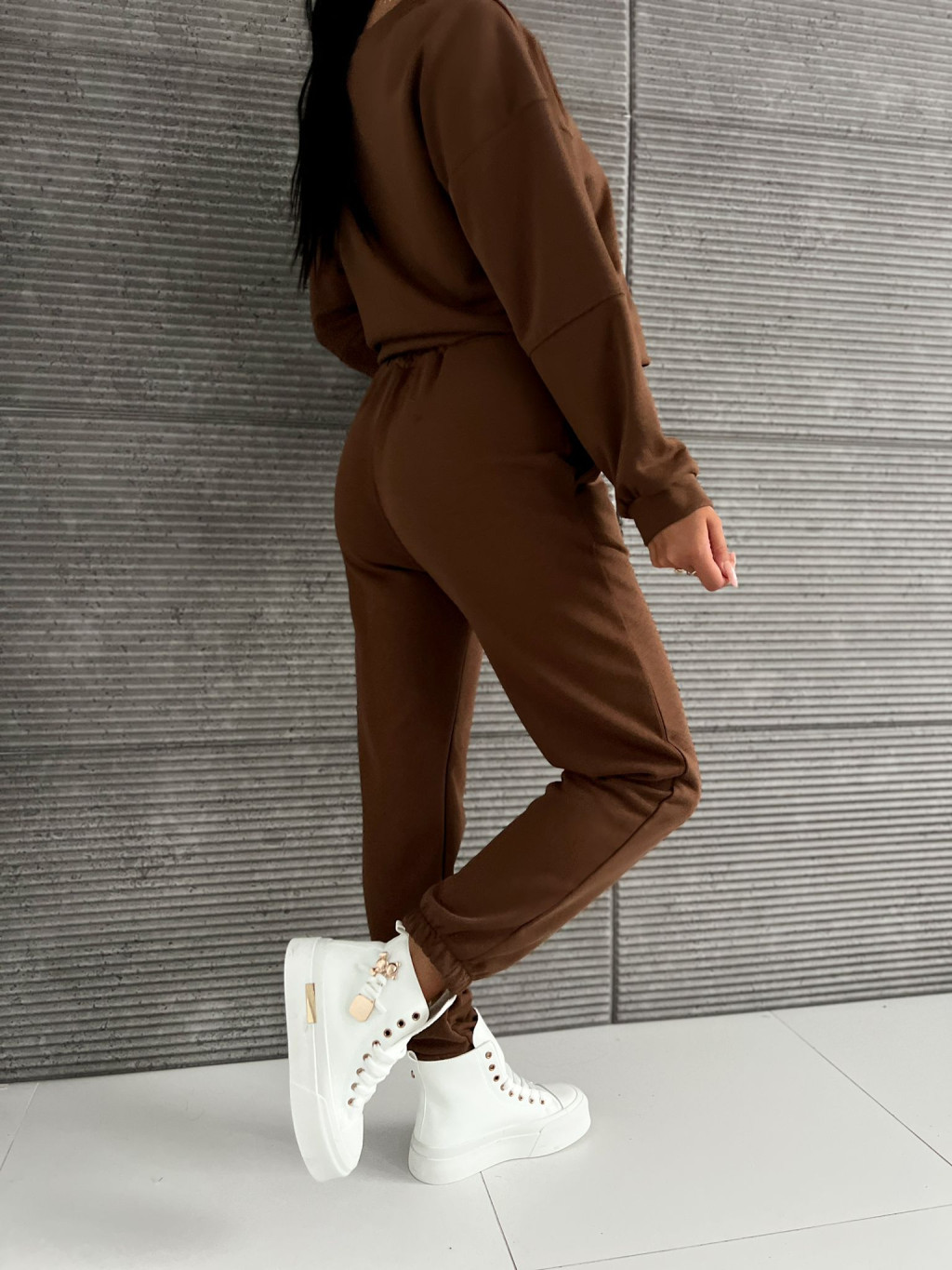 Mikina voľného strihu s okrúhlym výstrihom a spadnutým rukávom. Rukávy a mierne predĺžený zadný diel ukončený manžetou. Nohavice s bočnými vreckami, gumou v páse, šnúrkou na stiahnutie a gumičkovou manžetou.