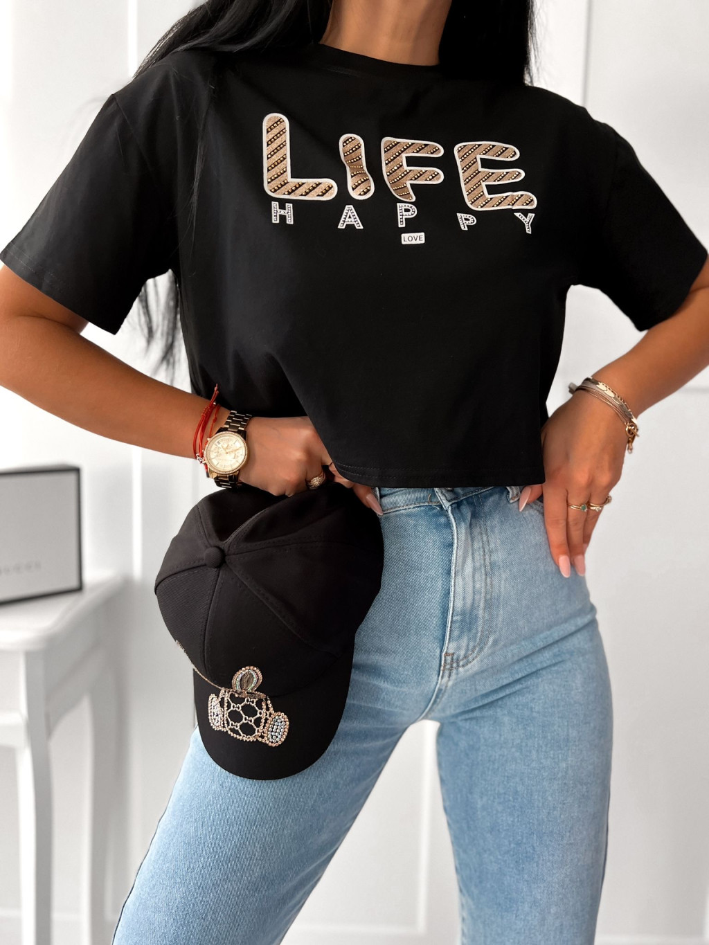 Bavlnené tričko zdobené kamienkovým nápisom.