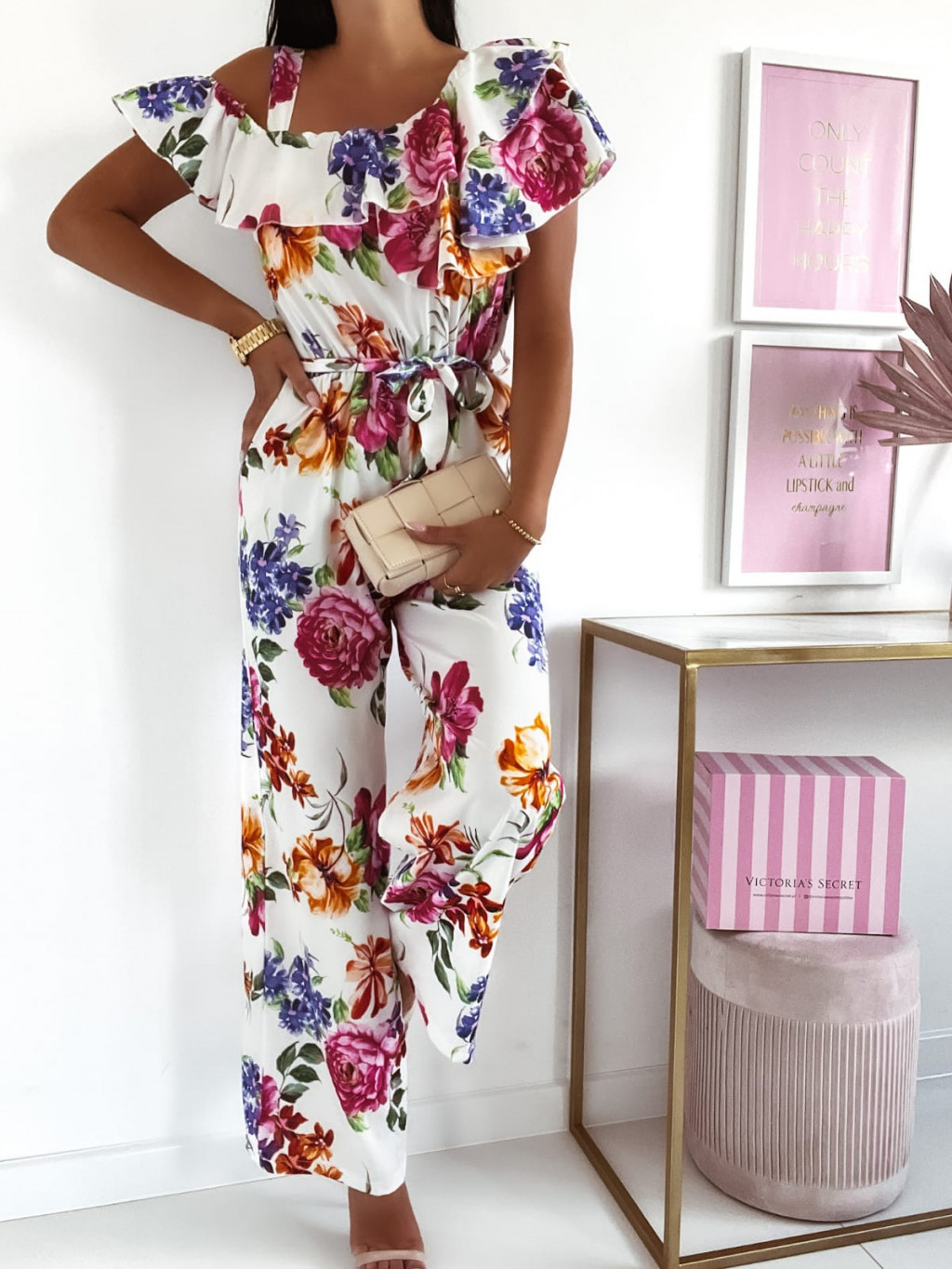 Štýlový vzorovaný nohavicový overál s volánovým vrchným dielom.