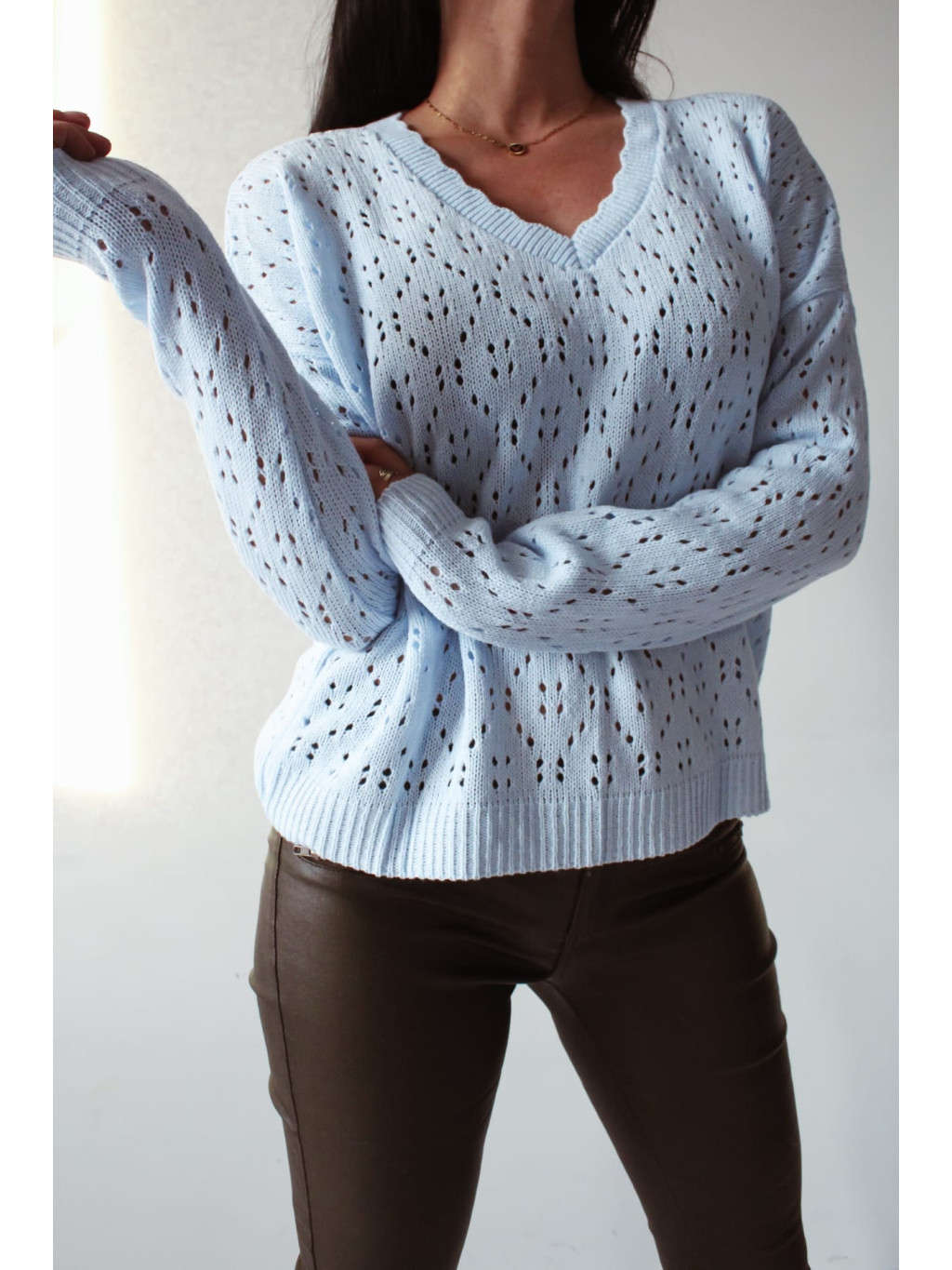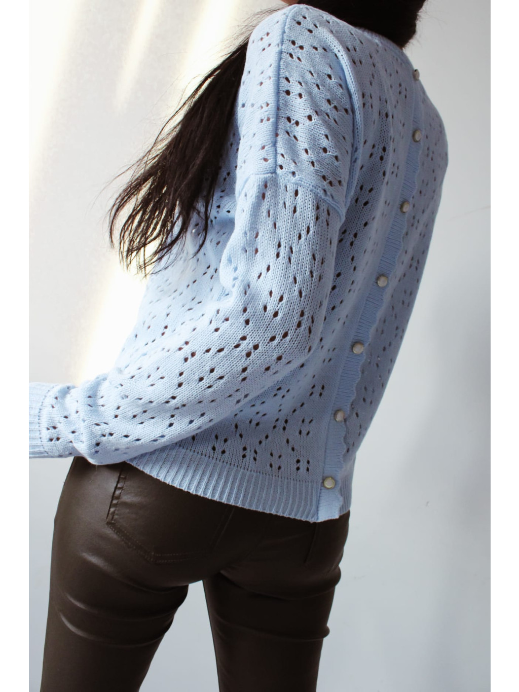 Perforovaný sveter s V-čkovým výstrihom zdobený na chrbte perlovými gombíkmi.