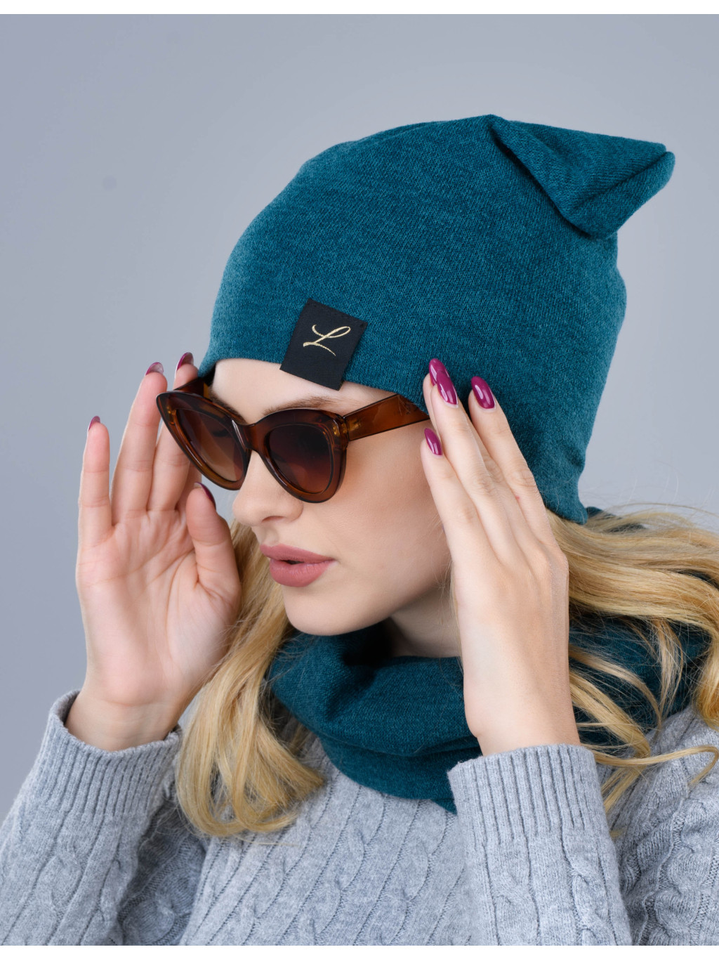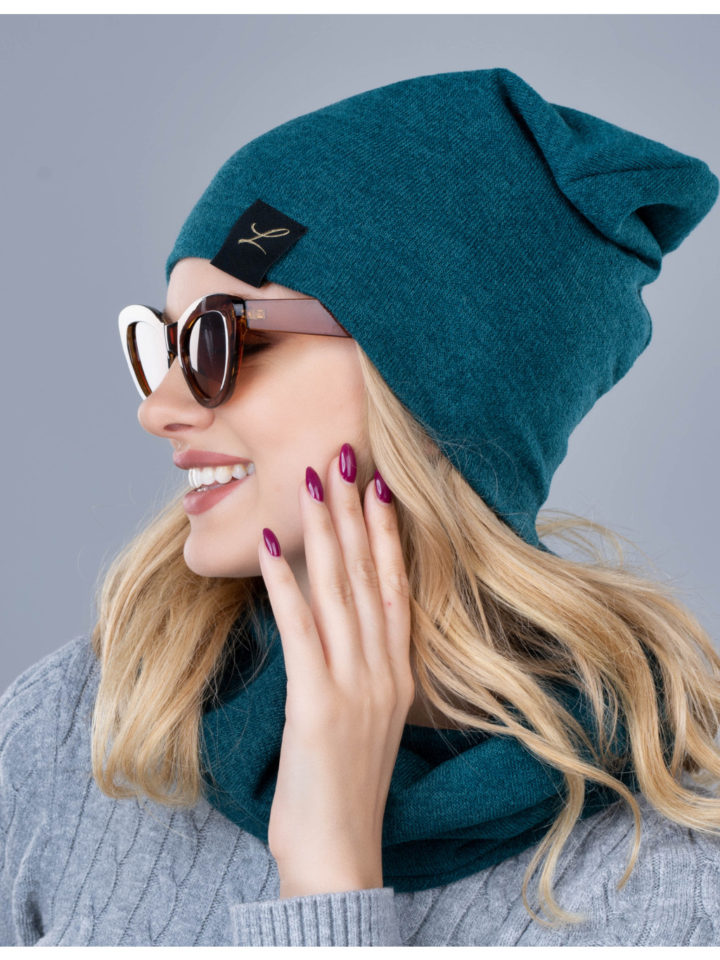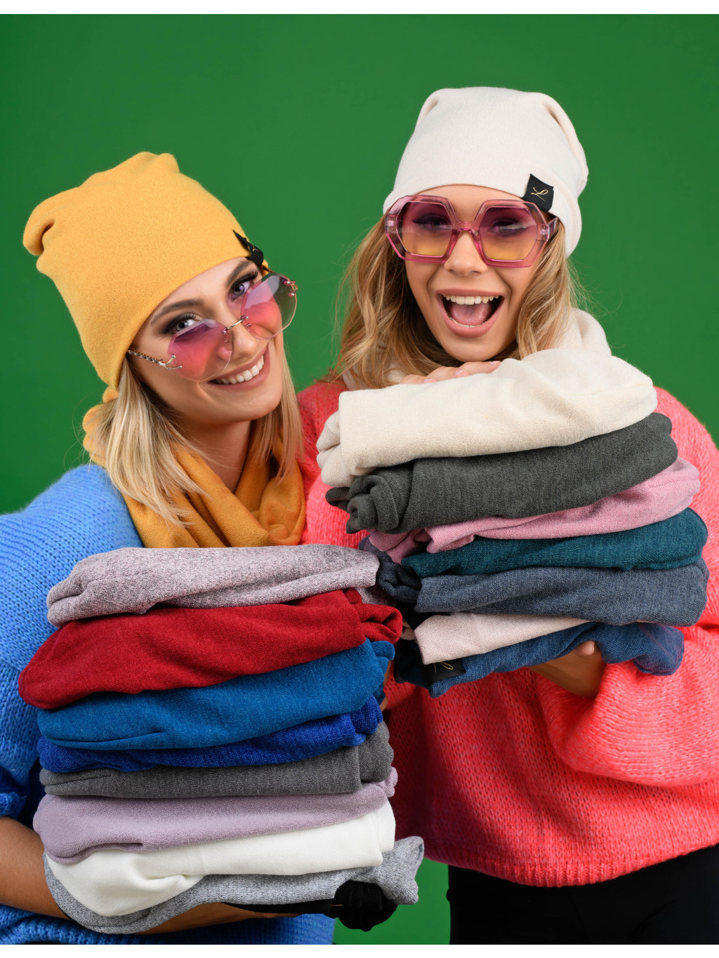 Nadčasový dámsky dvojvrstvový set pozostávajúci zo šmolko čiapky a šálu typu tunel/ nákrčník.