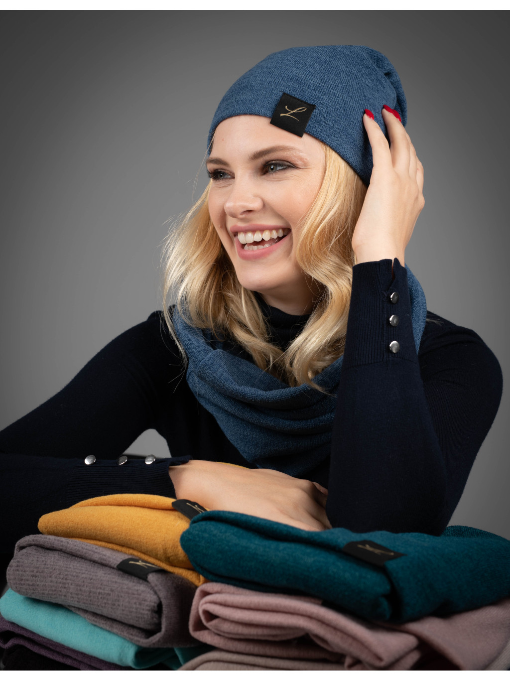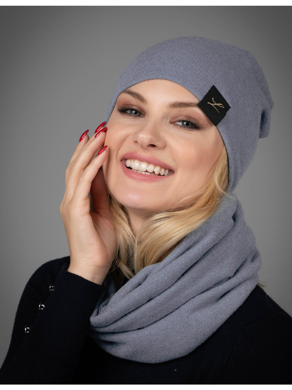 Nadčasový dámsky dvojvrstvový set pozostávajúci zo šmolko čiapky a šálu typu tunel/ nákrčník.