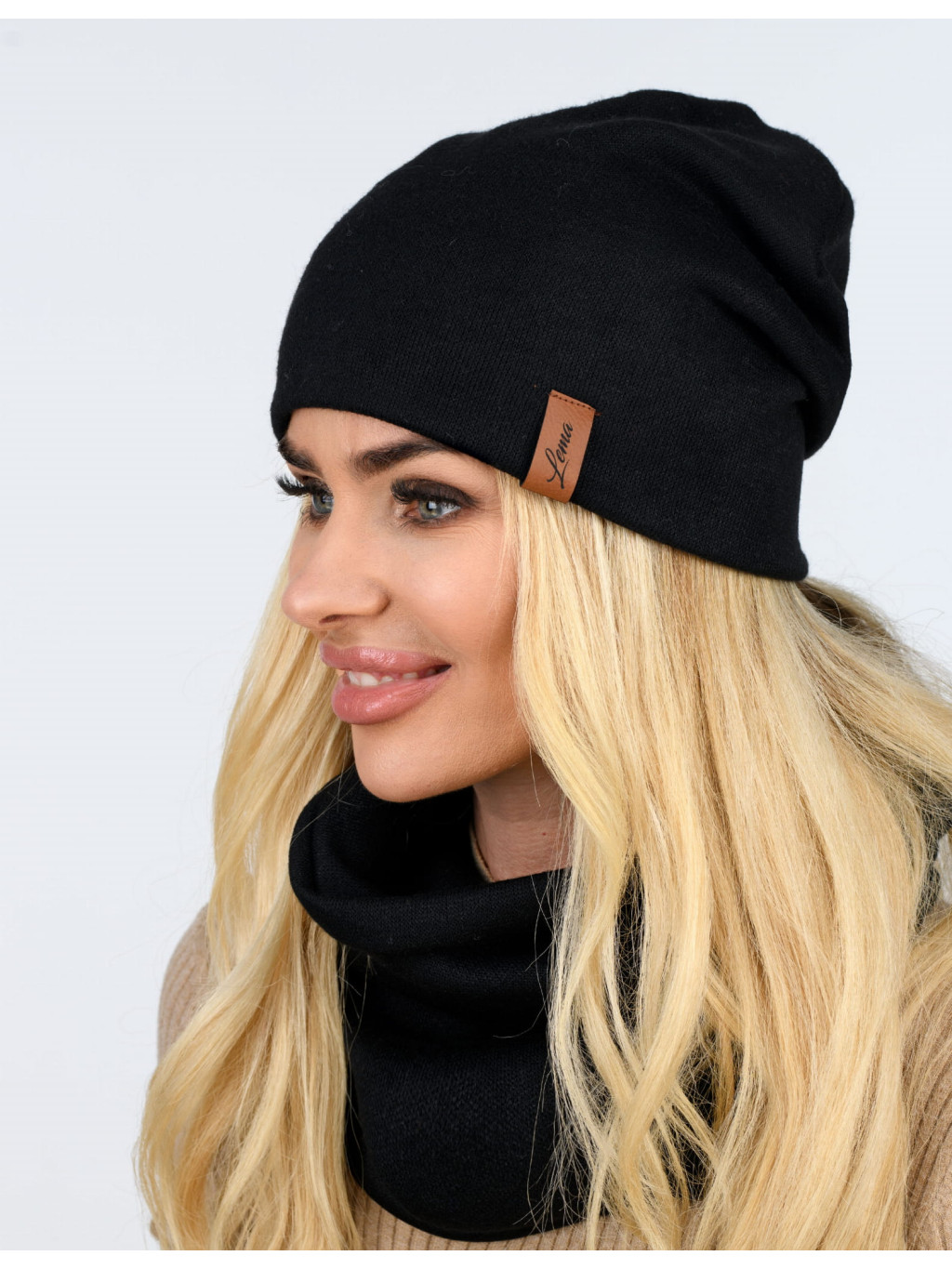 Set (čiapka + nákrčník) je vhodný na jeseň a zimu. Je vyrobený na dotyk z príjemnej, pružnej a hrejivej látky. Čiapka s decentnou koženou nášivkou.