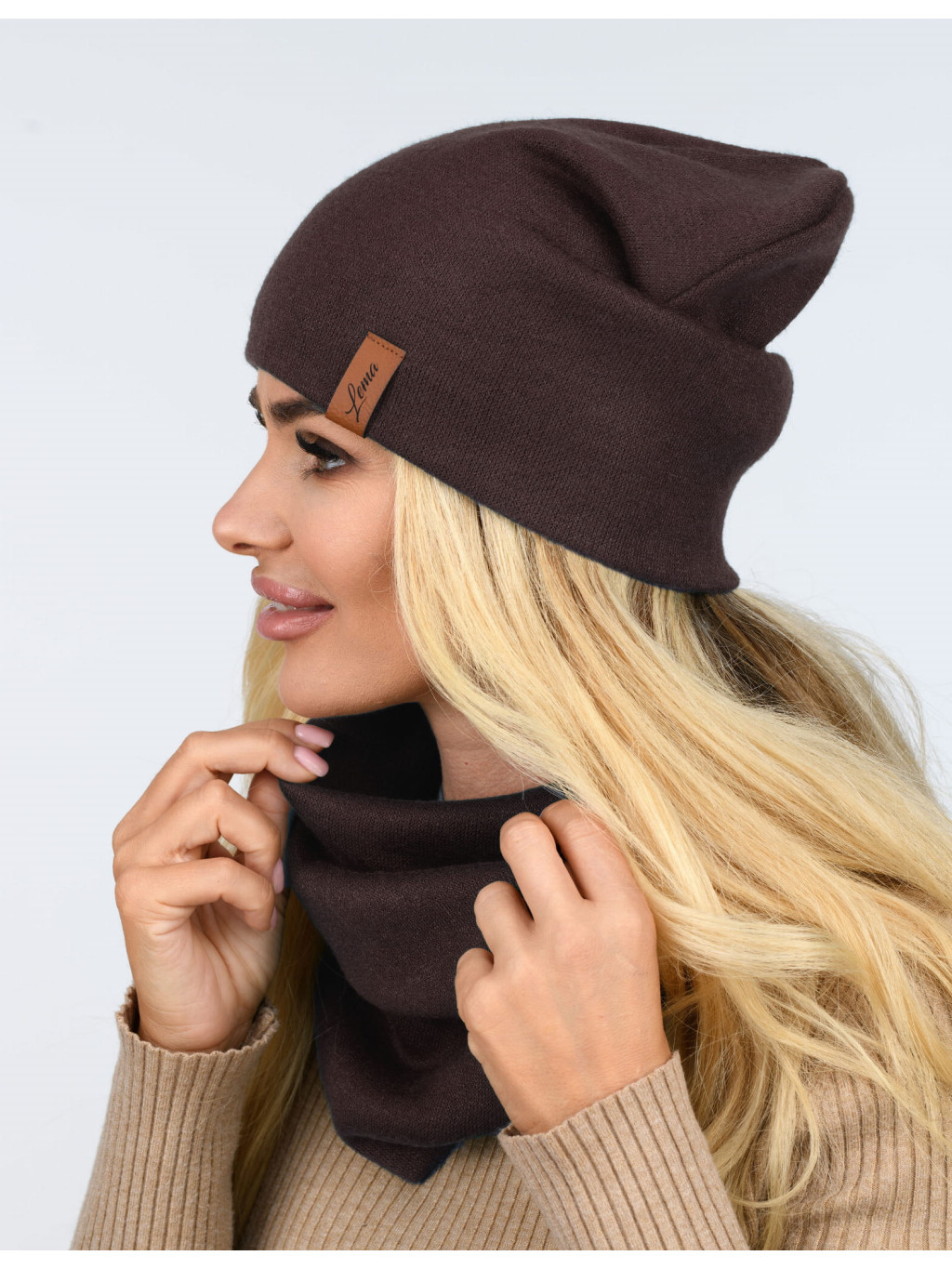 Set (čiapka + nákrčník) je vhodný na jeseň a zimu. Je vyrobený na dotyk z príjemnej, pružnej a hrejivej látky. Čiapka s decentnou koženou nášivkou.
