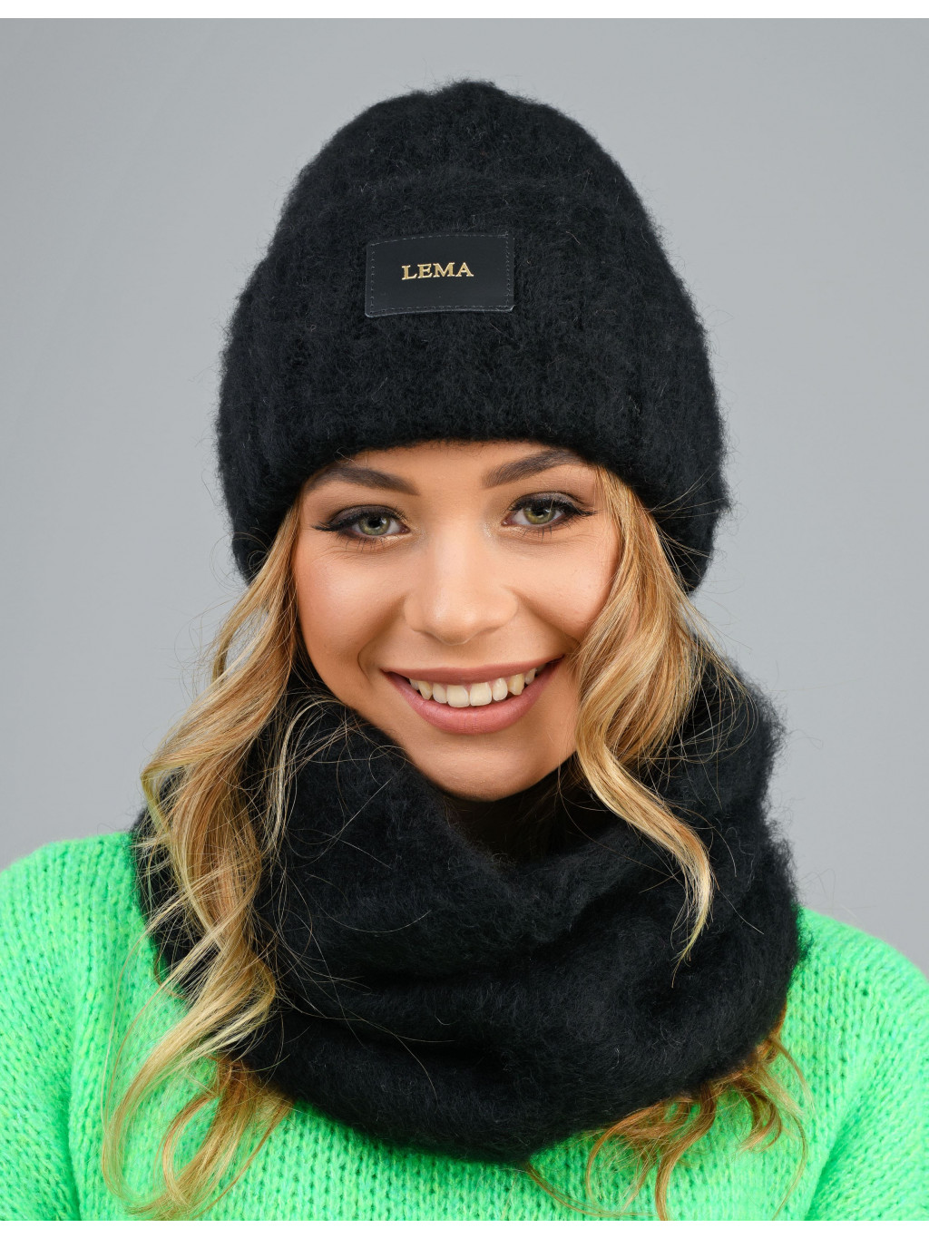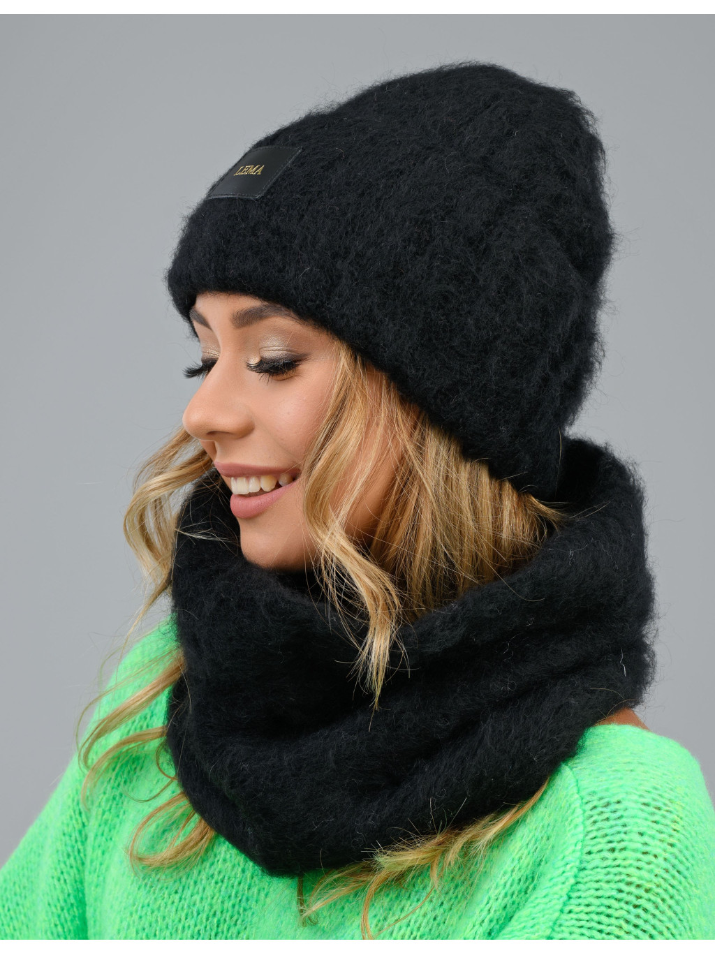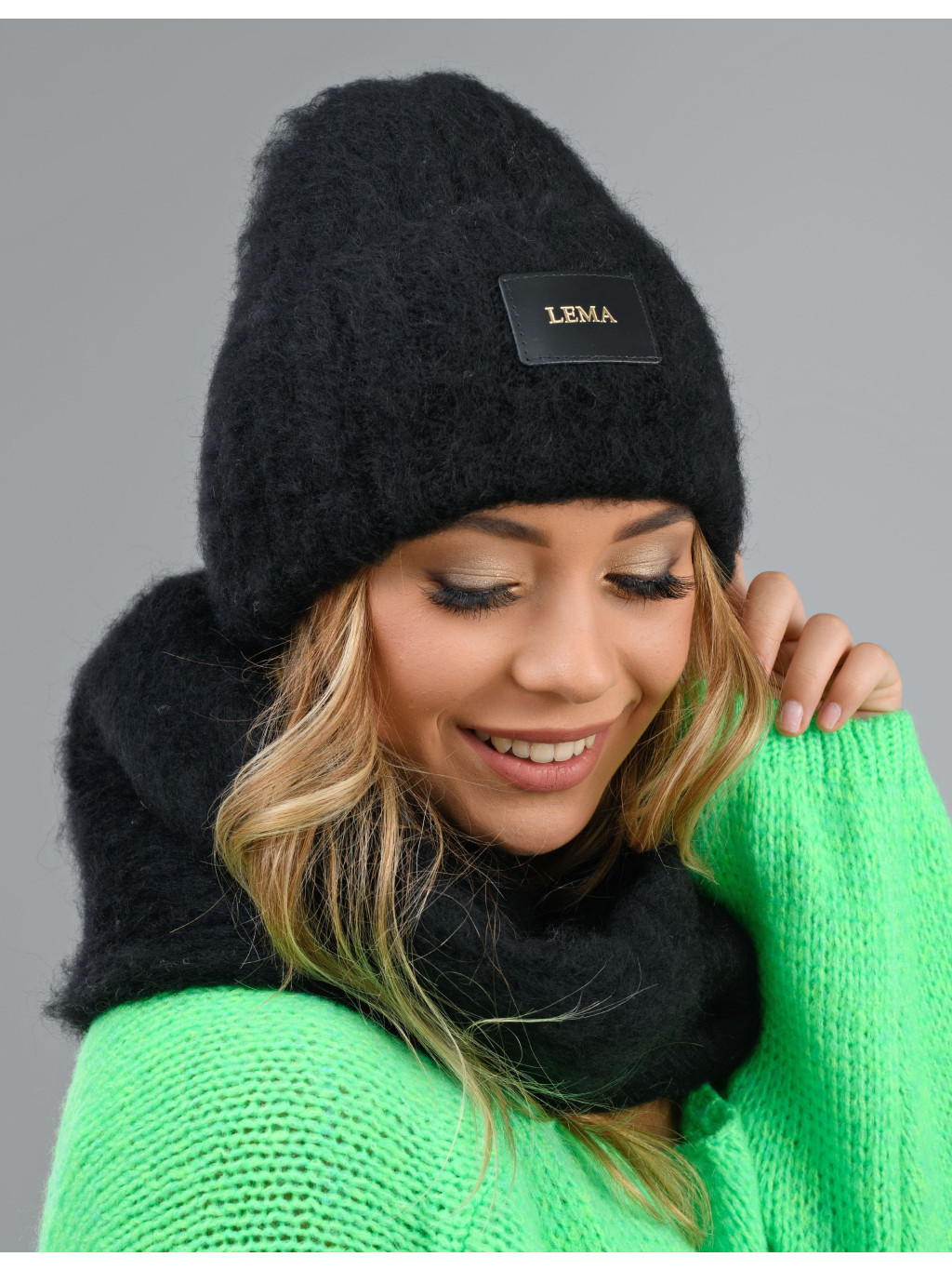 Prekladaná čiapka s decentnou koženou nášivkou. Set (čiapka + tunel) je vhodný na zimu.  Je vyrobený na dotyk z príjemného teplého materiálu.