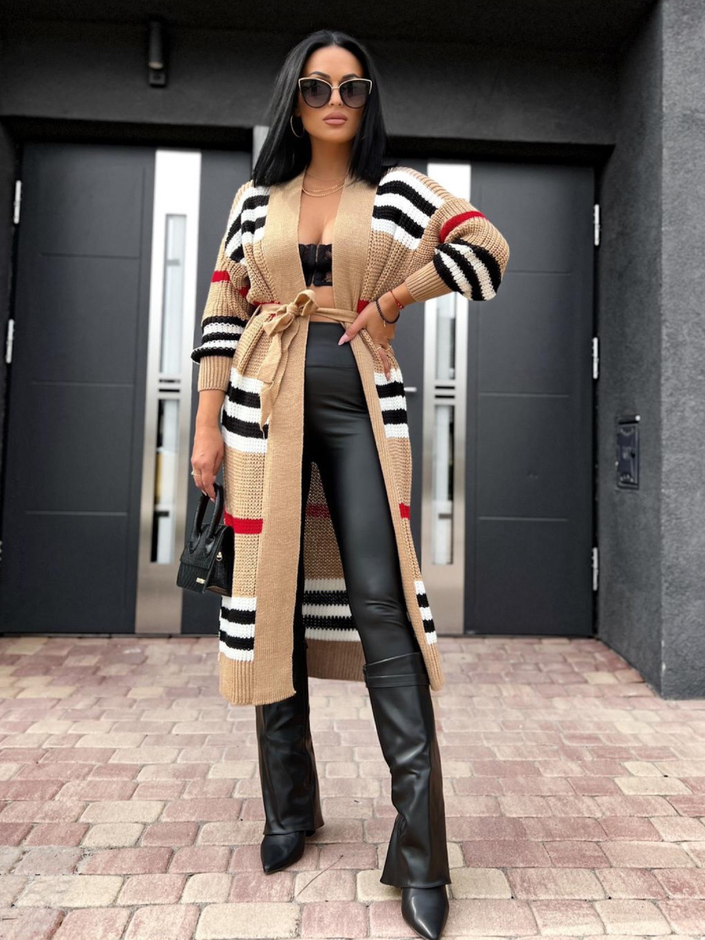 Dlhý pletený kardigán so spadnutými rukávmi doplnený opaskom.