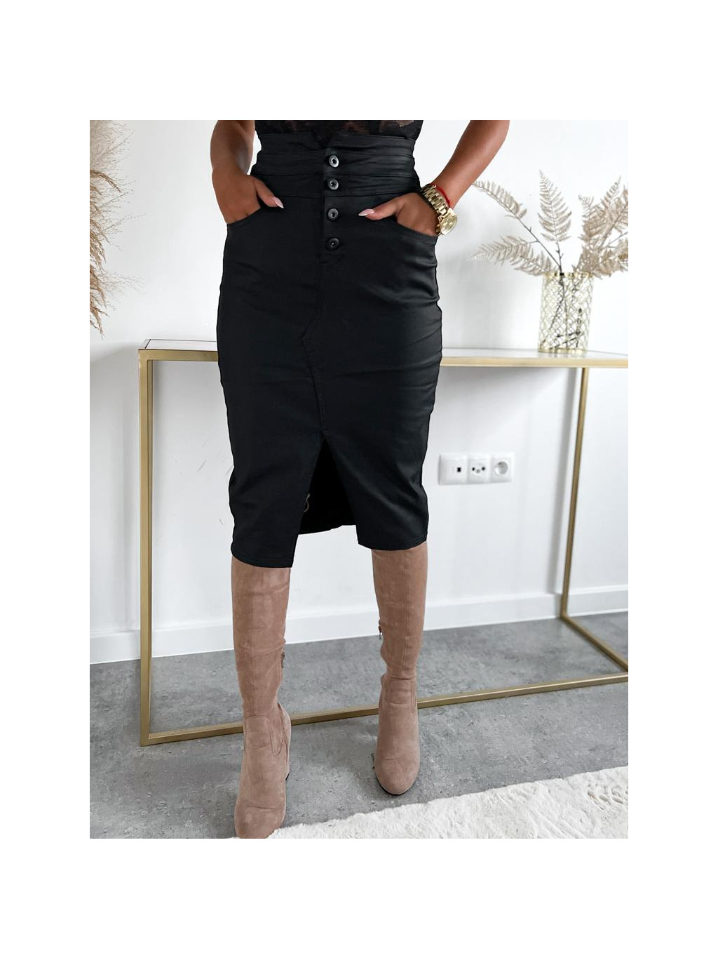 Sukňa s vysokým pásom, predným rozparkom a zapínaním na gombíky. Sukňa s prednými a zadnými vreckami.