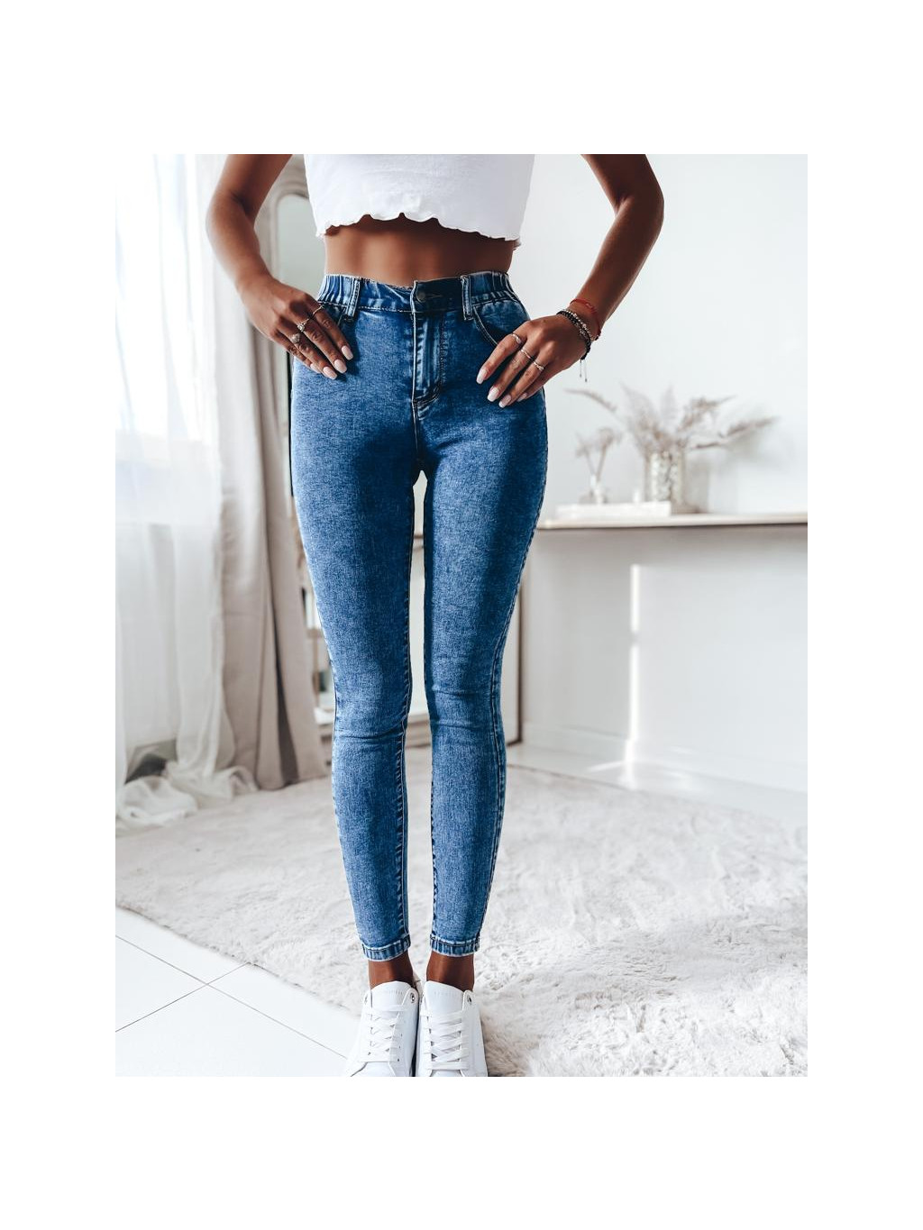 Rifle s gumou v páse v zadnej časti v hladkom nadčasovom vzhľade. Rifle s bočnými a zadnými vreckami. Rifle so zapínaním na zips a gombík.