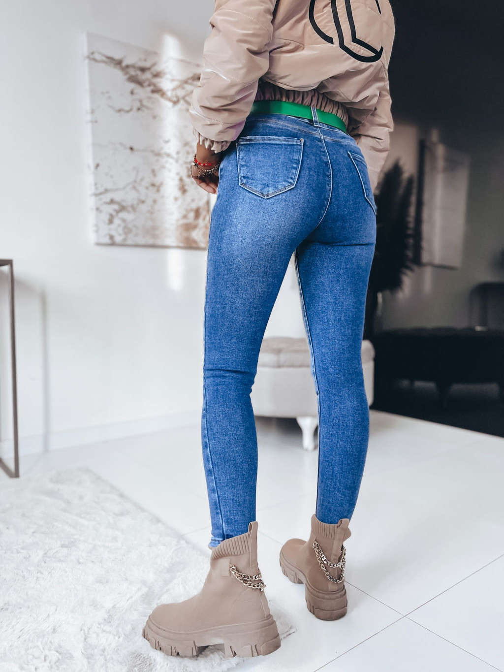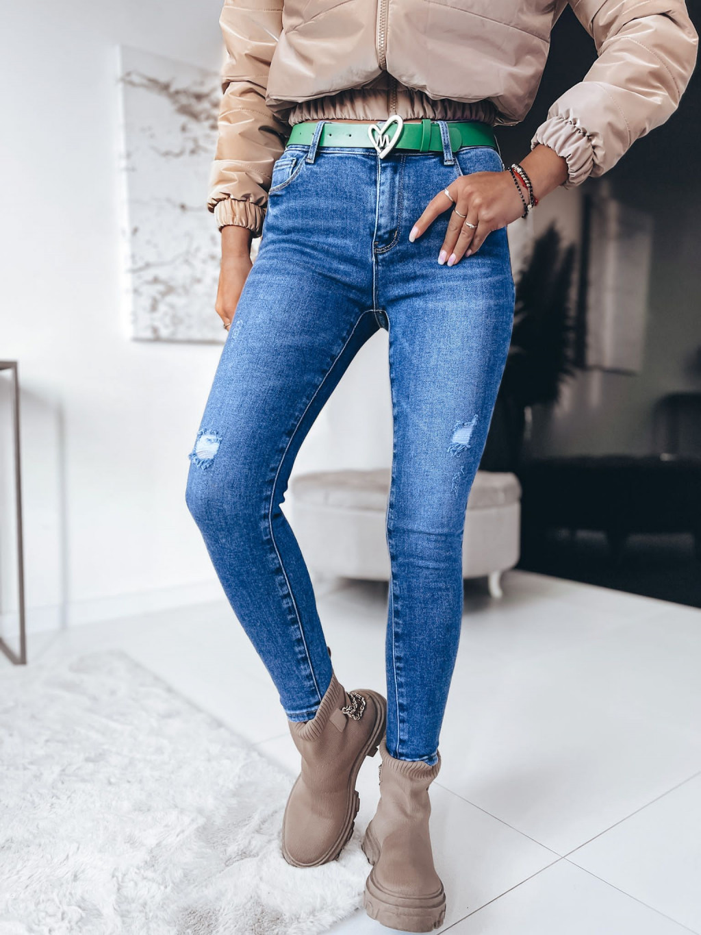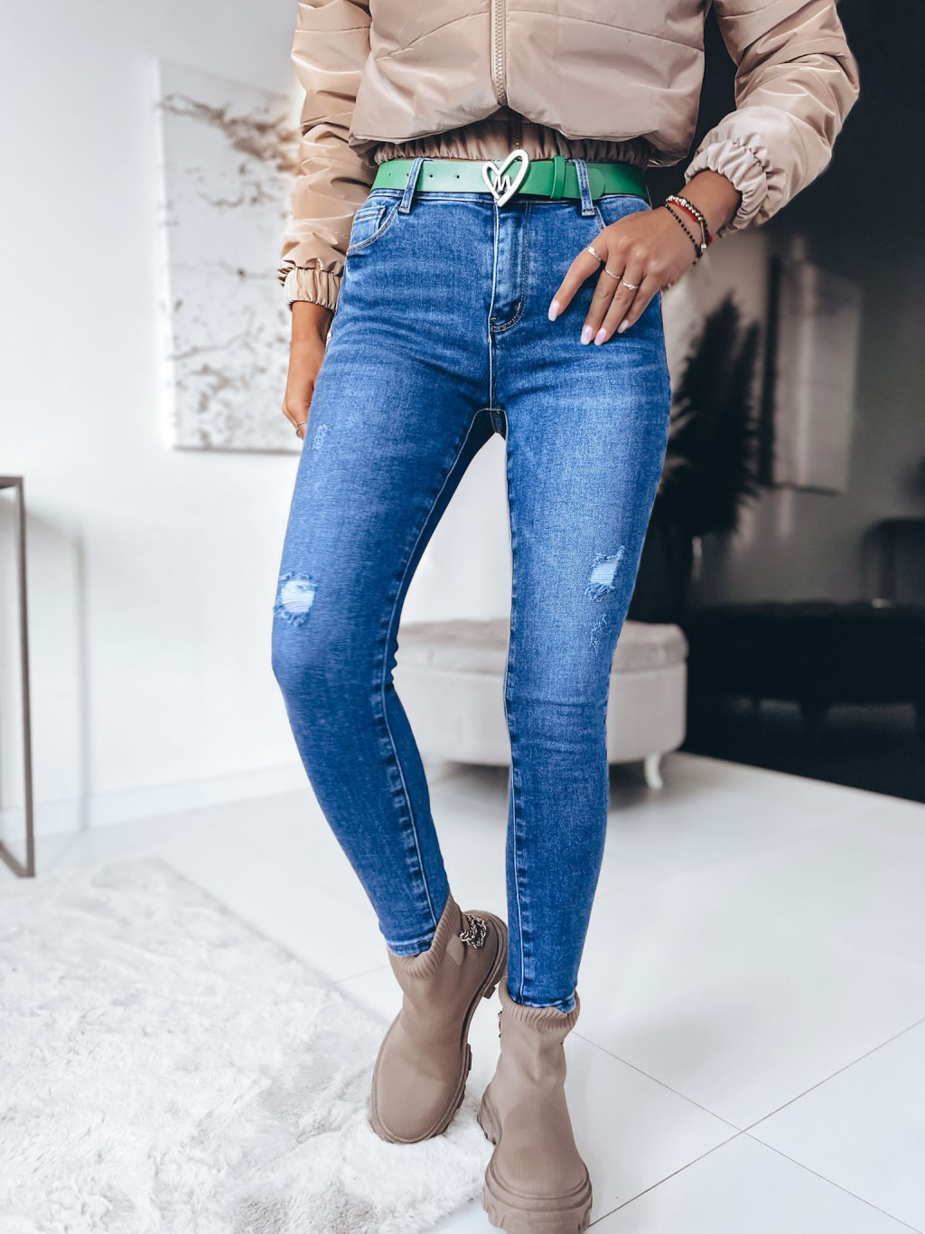 Rifle so zapínaním na zips a gombík. Rifle s prednými a zadnými vreckami. Súčasťou modelu je opasok.