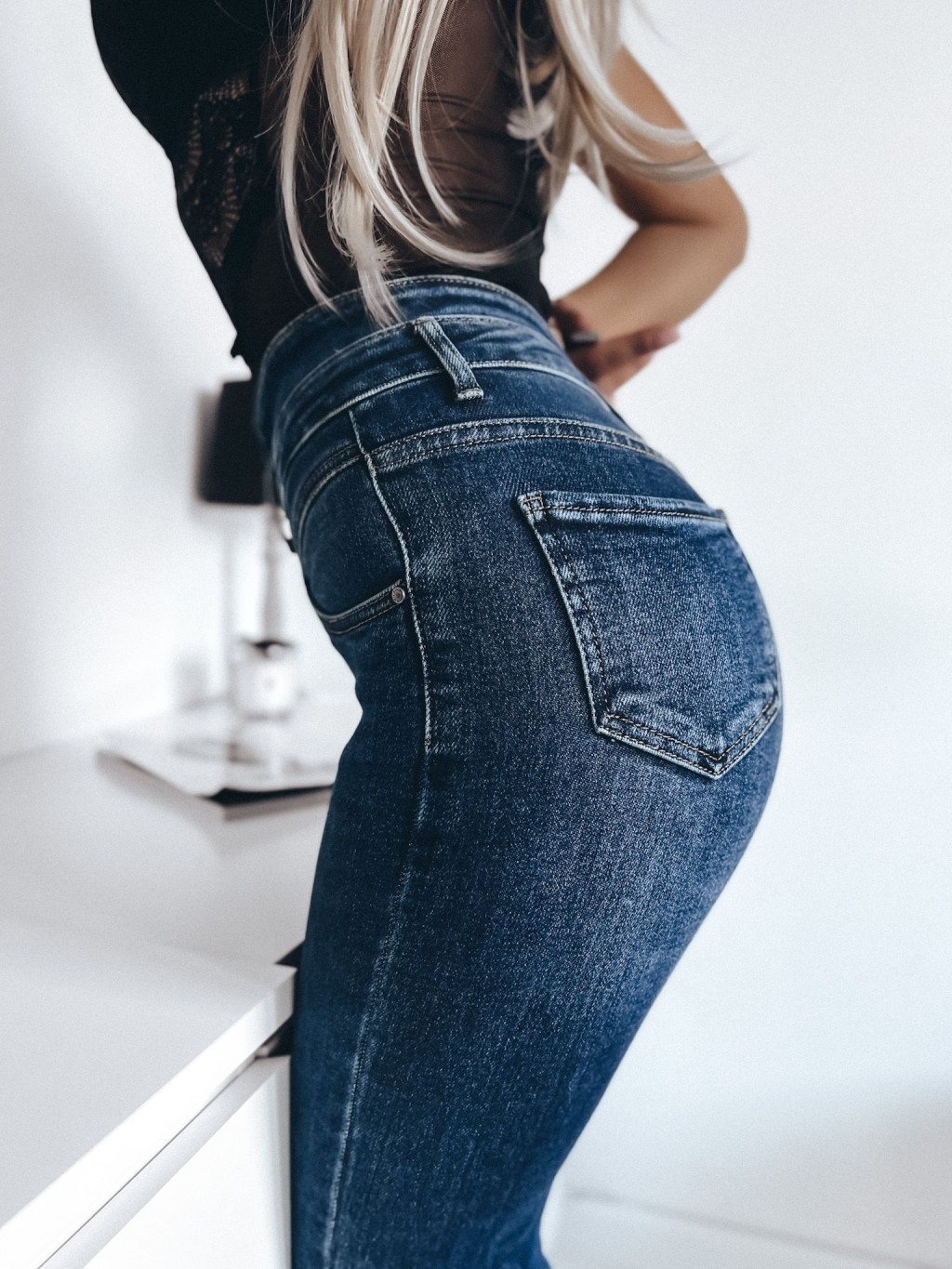 Rifle so zapínaním na gombíky. Rifle s prednými a zadnými vreckami.