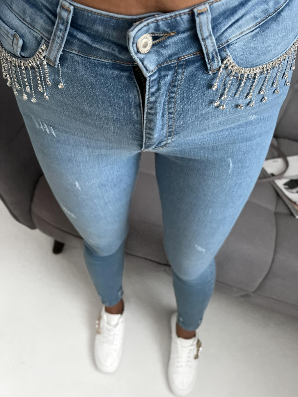 Jemne ošúchané skinny rifle zdobené štrasovými strapcami.