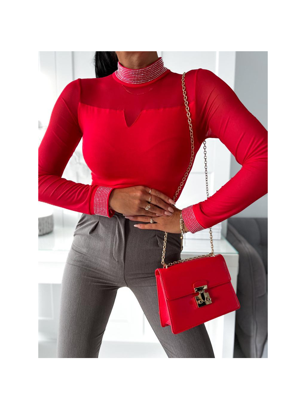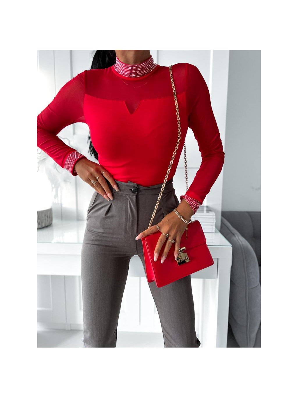 Elegantný top s dlhým rukávom zdobený kamienkami.