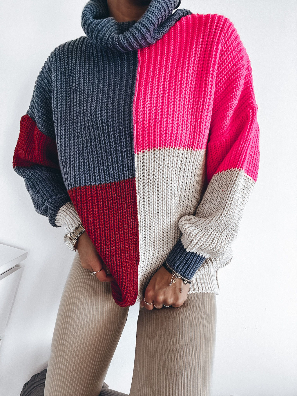 Pletený viacfarebný rolákový sveter voľnejšieho strihu.