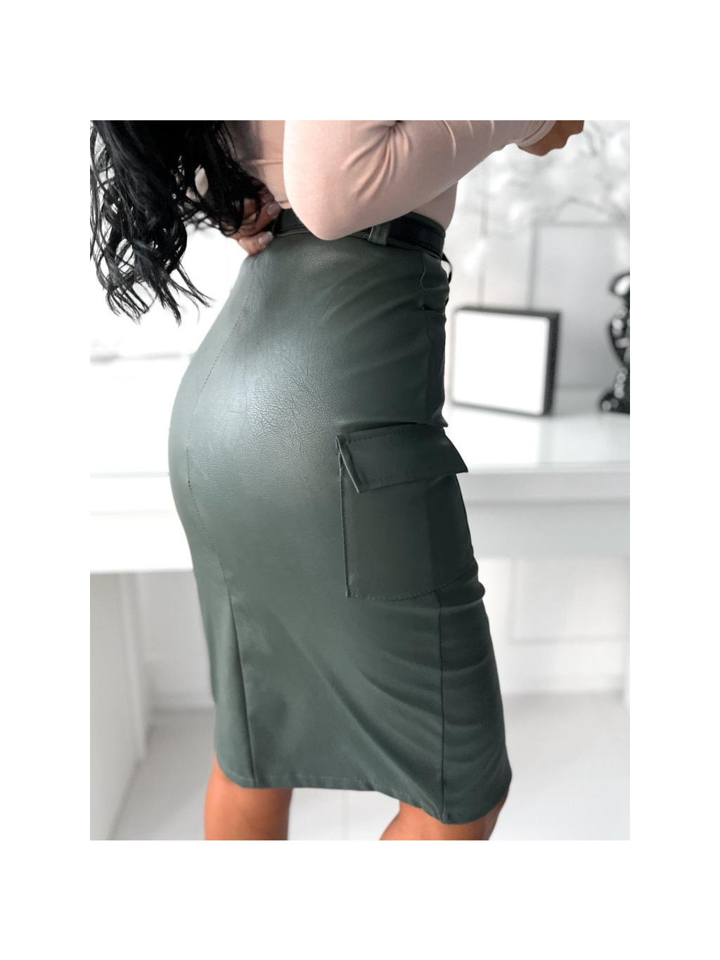 Elastická koženková cargo sukňa s vysokým pásom.