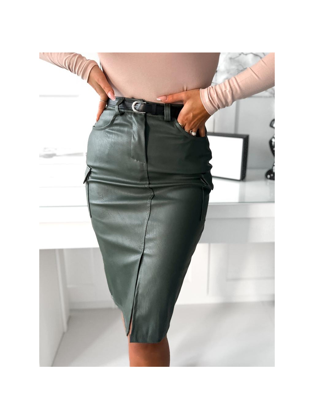 Sukňa so zapínaním na zips a gombík. Sukňa s rozparkom a bočnými vreckami. Súčasťou modelu je opasok.