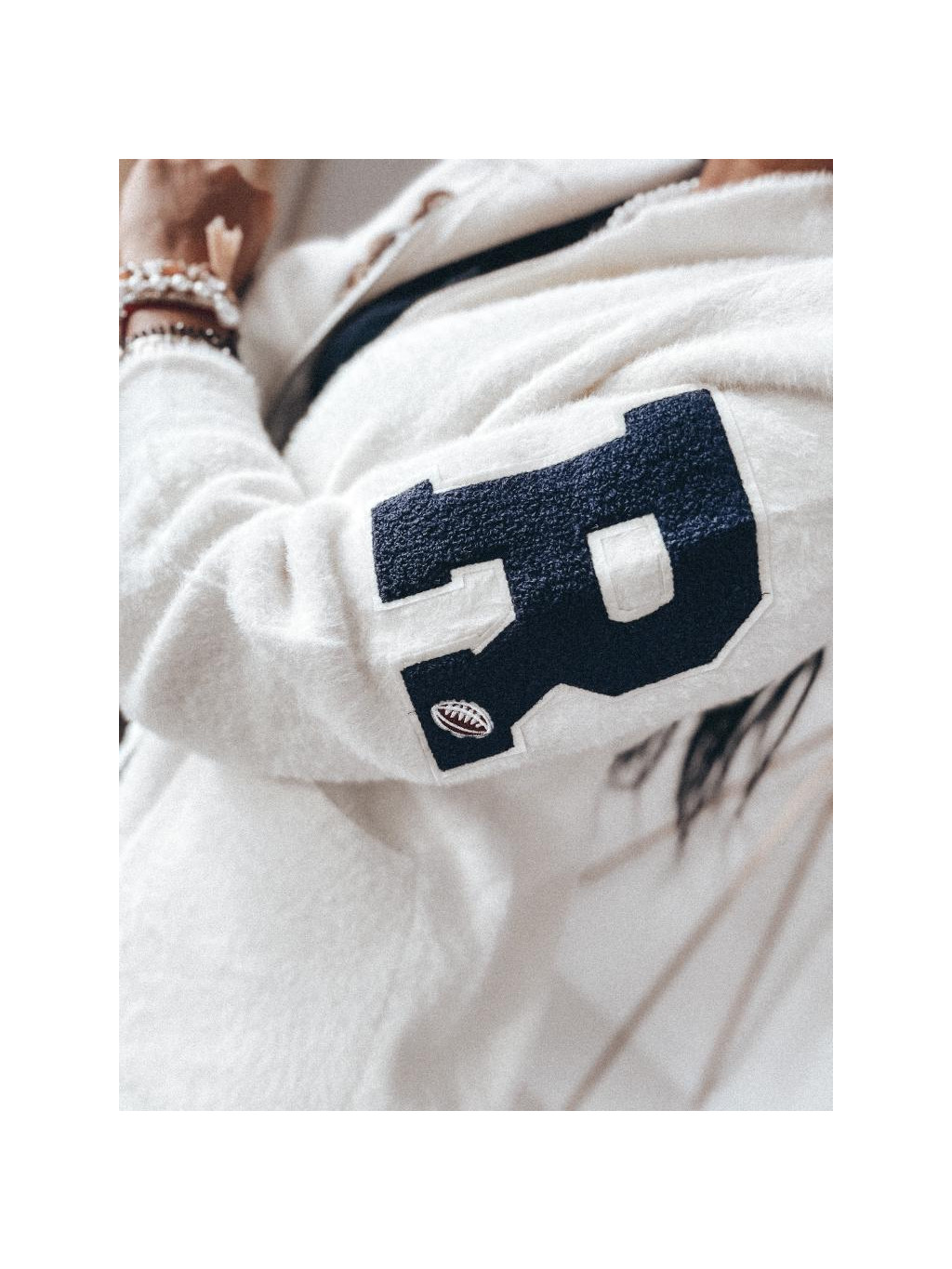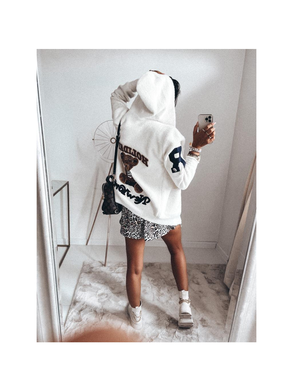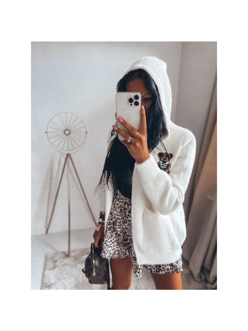 Mäkký Alpaka kabátik s kapucňou zdobený nášivkami.