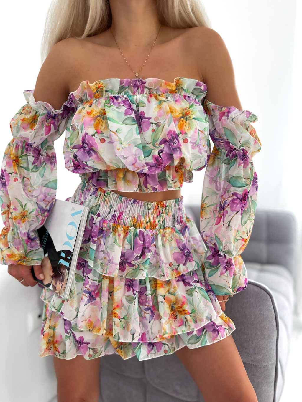 Letný volánový komplet v zložení crop hispánskej blúzky a sukne.