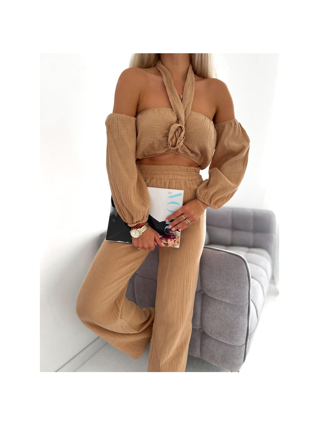 Nohavicový komplet v zložení crop topu a širokých nohavíc. Top v hispánskom štýle s viazaním zdobený 3D ružou. Nohavice so širokou gumou v páse.