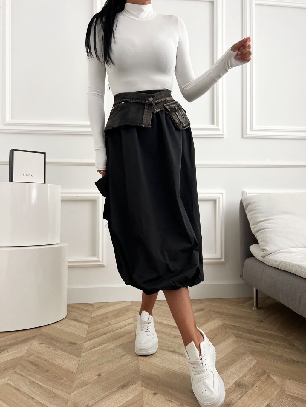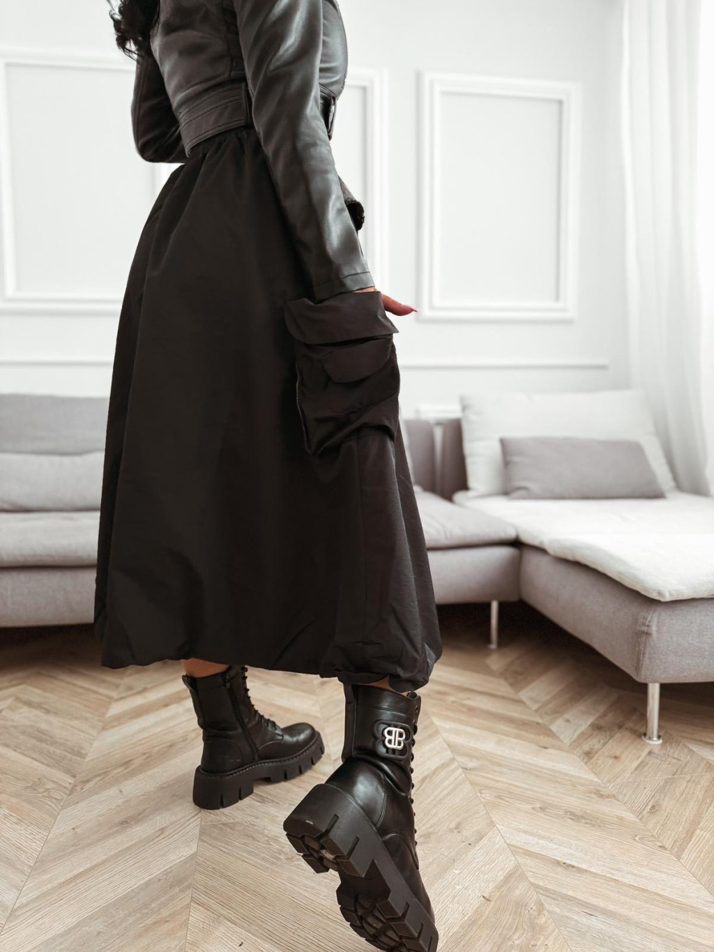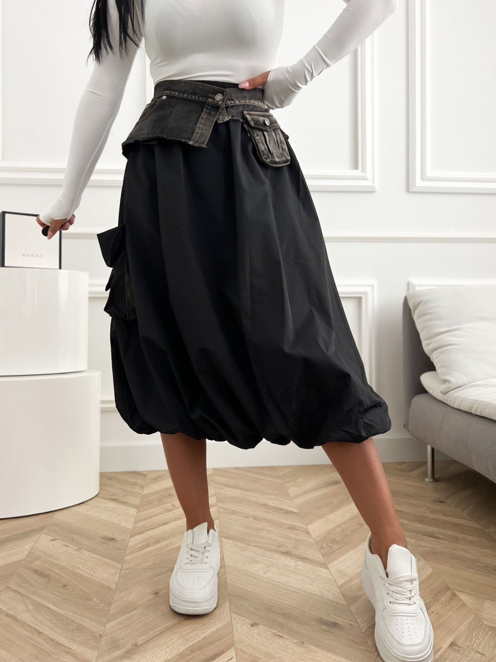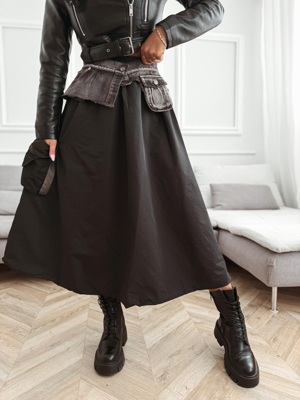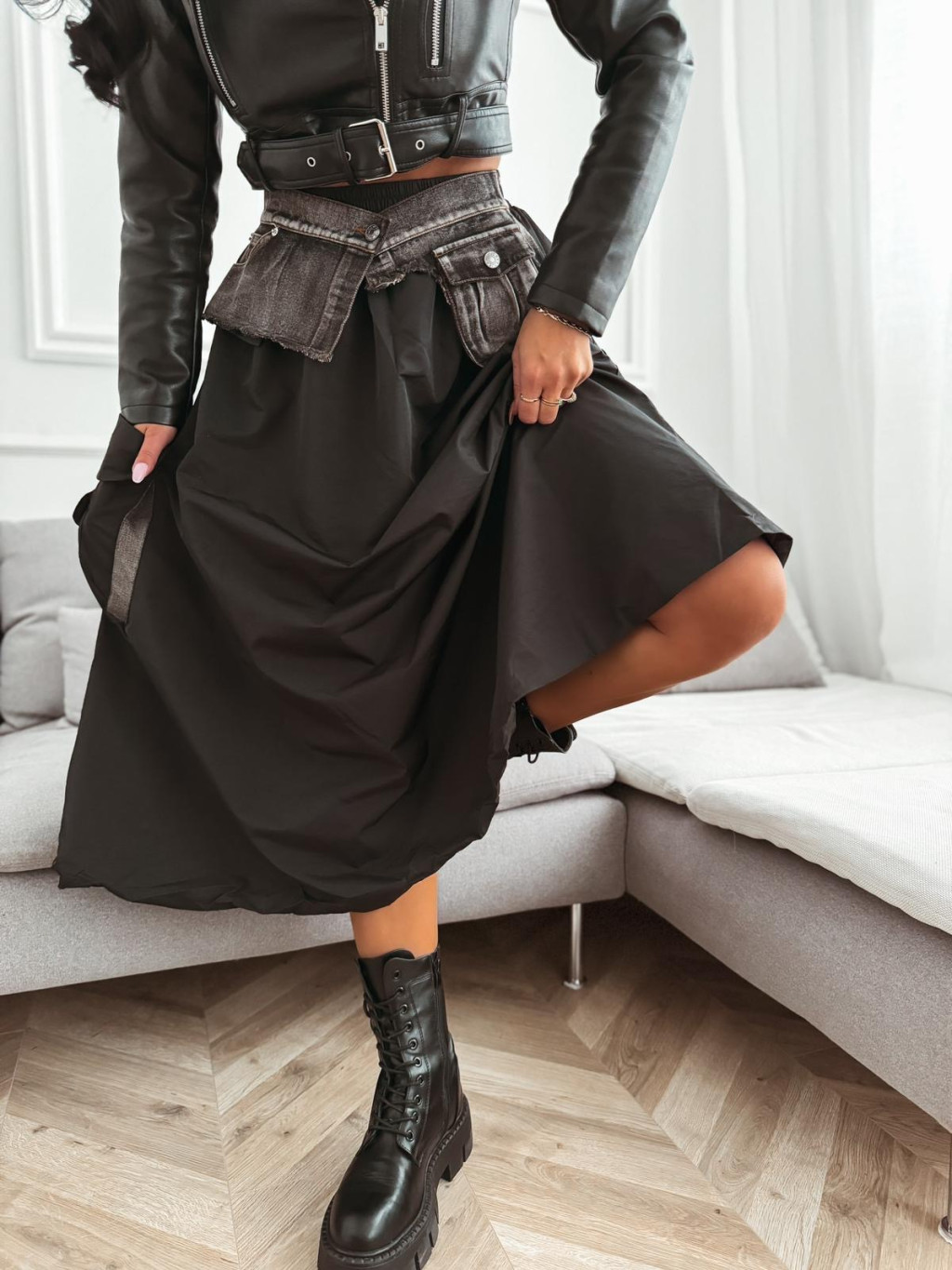 Sukňa s dominnantným bočným vreckom, podšívkou a gumou v páse.