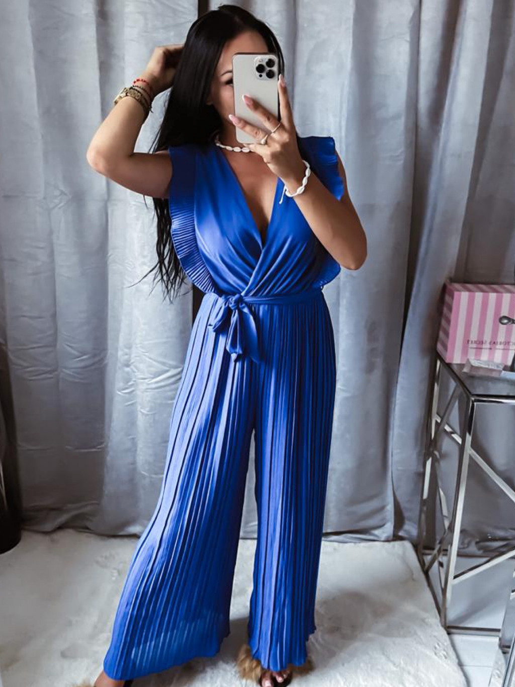 Vrchný diel v zavinovacom vzhľade doplnený volánom. Overál s gumičkou v páse doplnený opaskom vo farbe overálu.