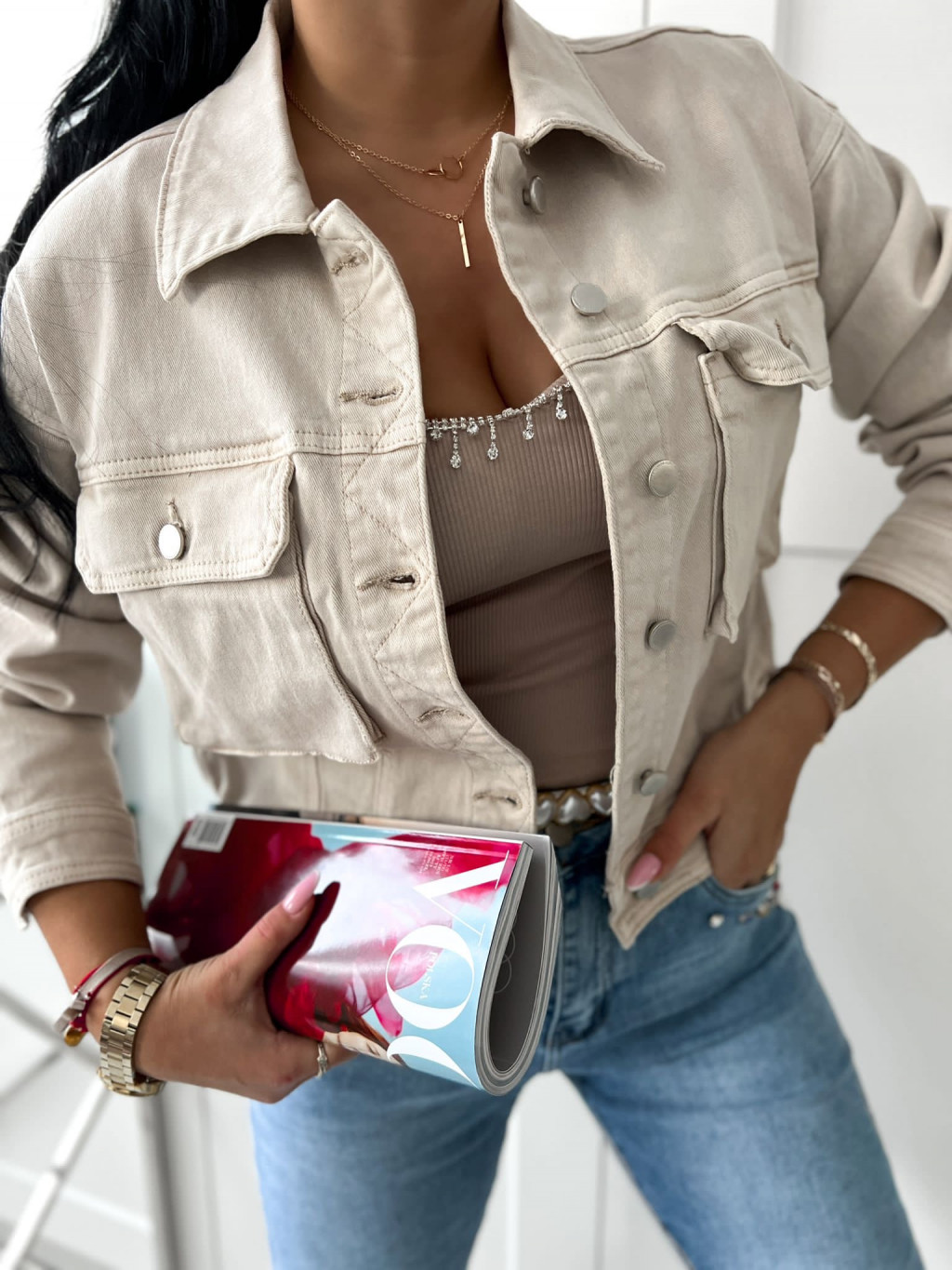 Bunda z mäkkej elastickej rifľoviny a zapínaním na gombíky. Model s veľkými náprsnými vreckami.
