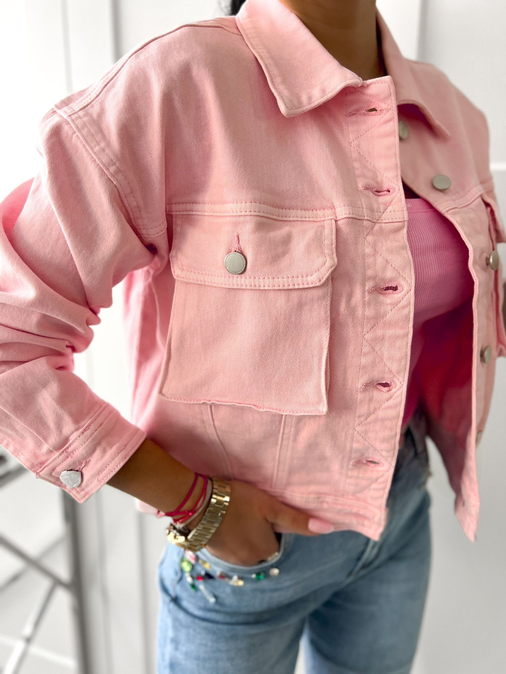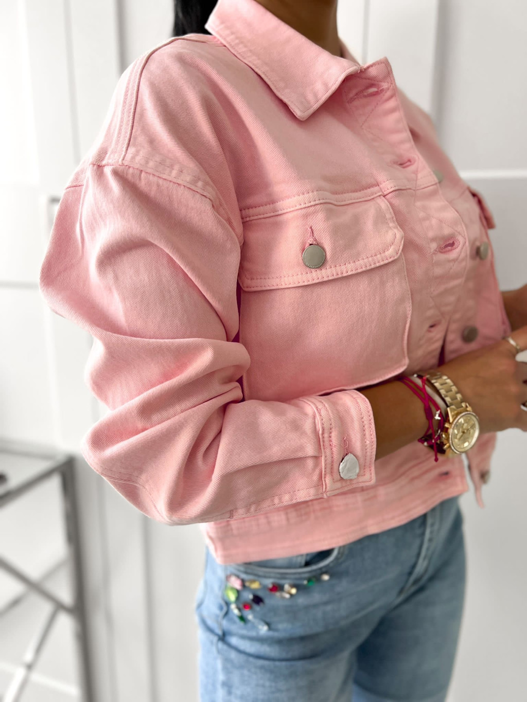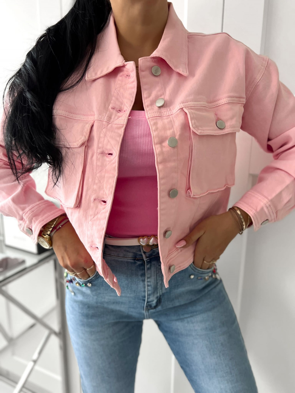 Bunda z mäkkej elastickej rifľoviny a zapínaním na gombíky. Model s veľkými náprsnými vreckami.