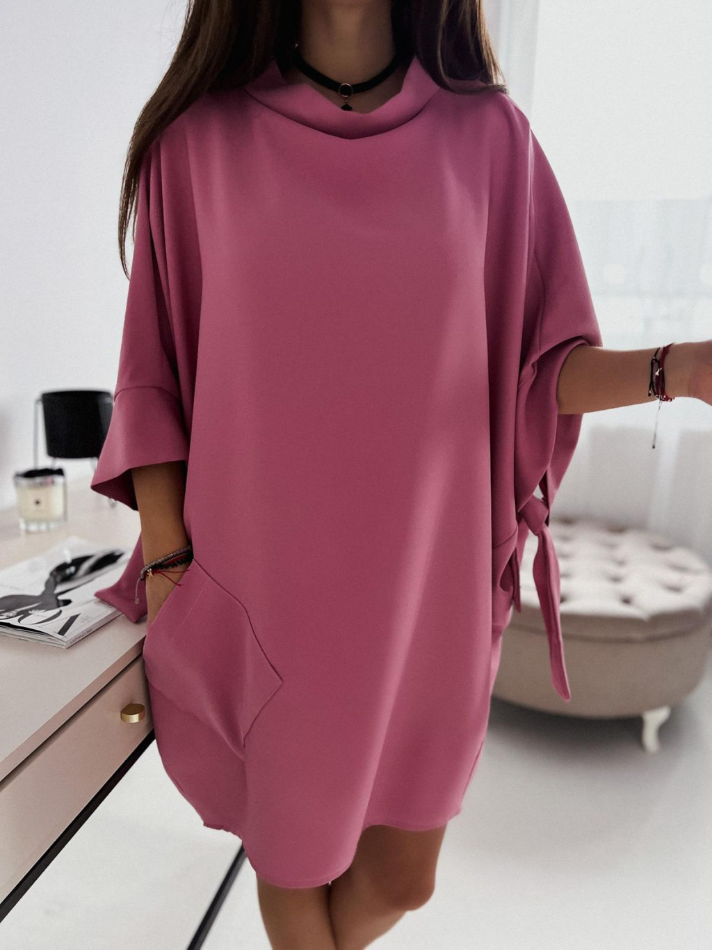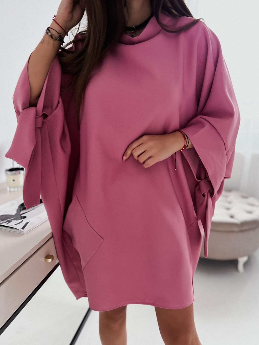 Šaty s predným vreckom, predĺženým zadným dielom a rukávom zdobeným mašľou.