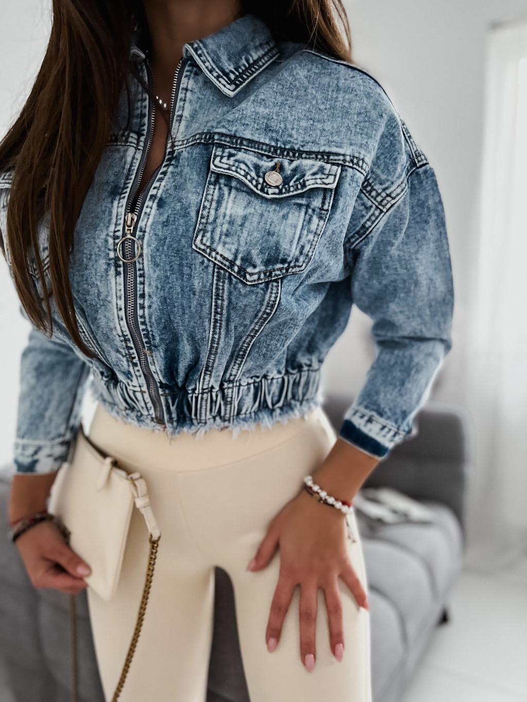 Trendy krátka rifľová bunda v oversize strihu so zapínaním na zips.