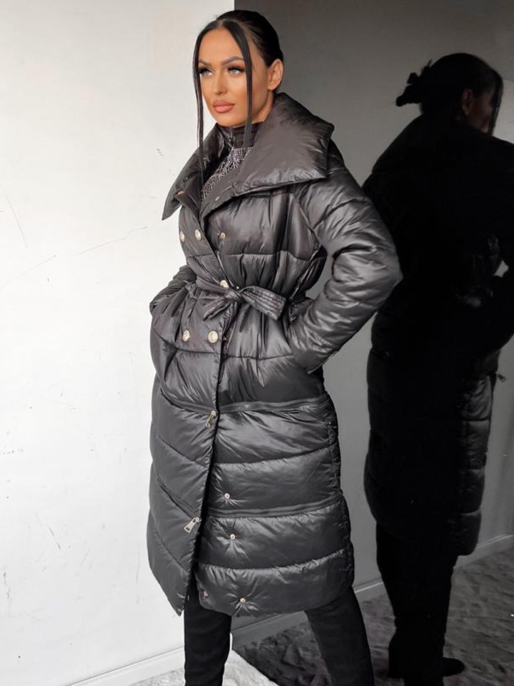 Dlhá prešívaná zimná bunda 3v1 s opaskom.