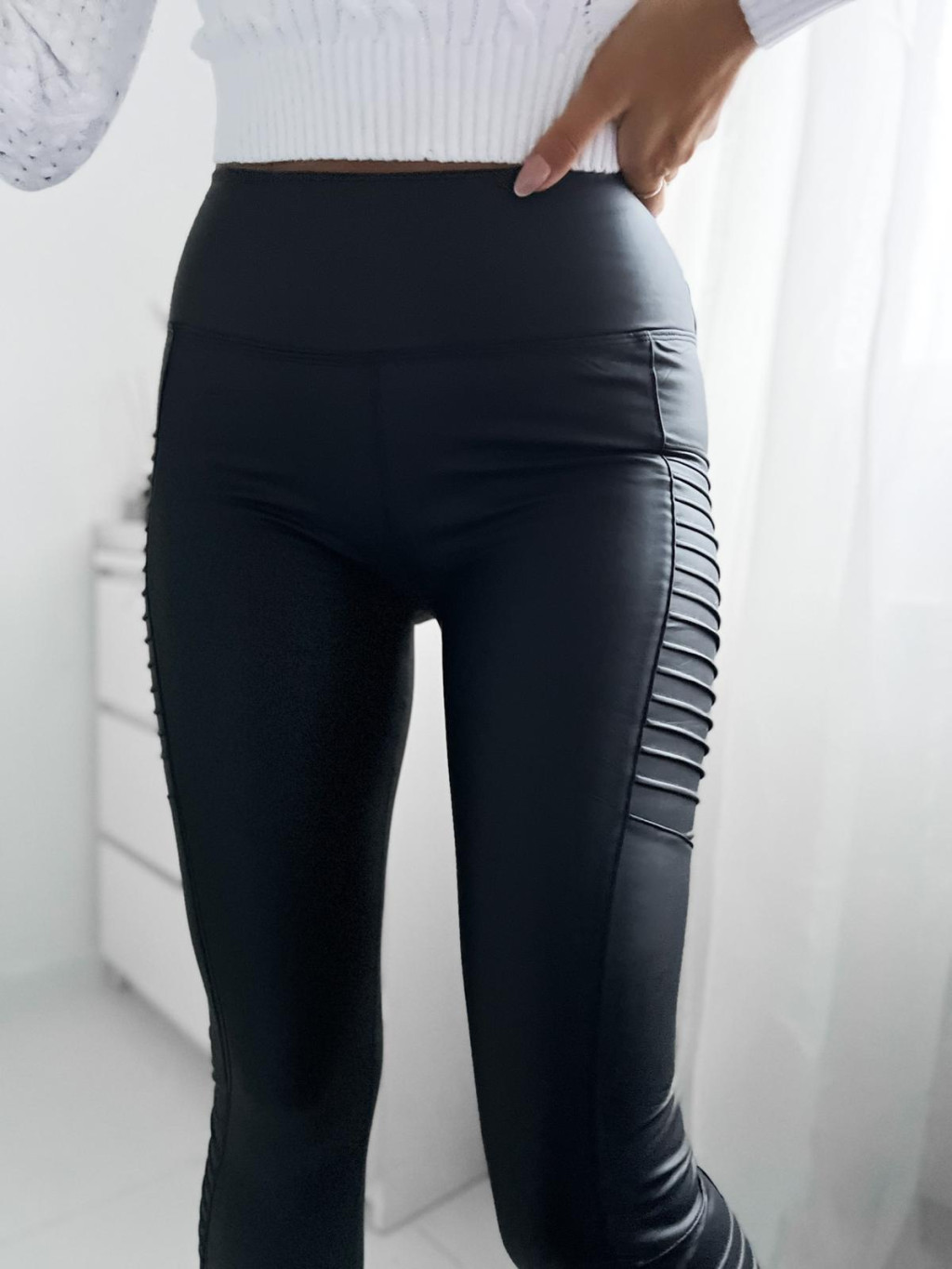 Zateplené koženkové legíny s vysokým širokým pásom a výrazným prešívaním po bokoch.