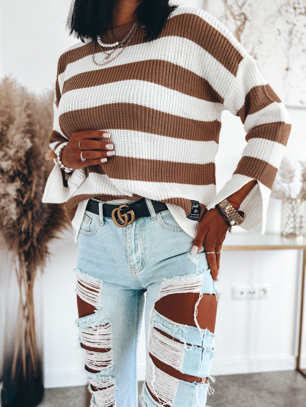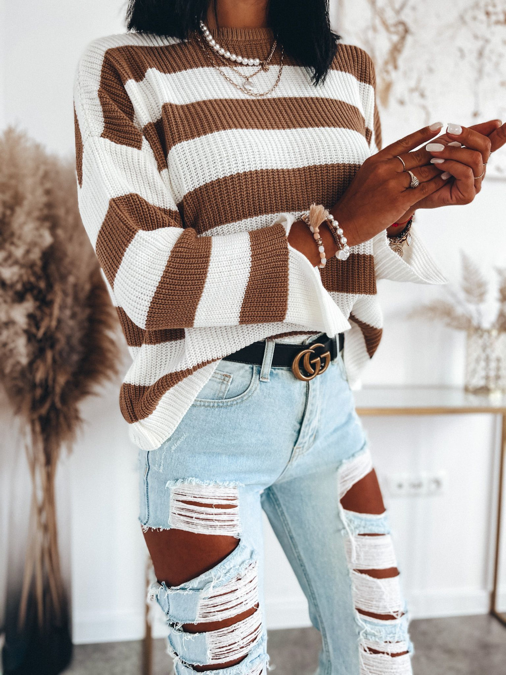 Moderný pruhovaný sveter voľnejšieho strihu.