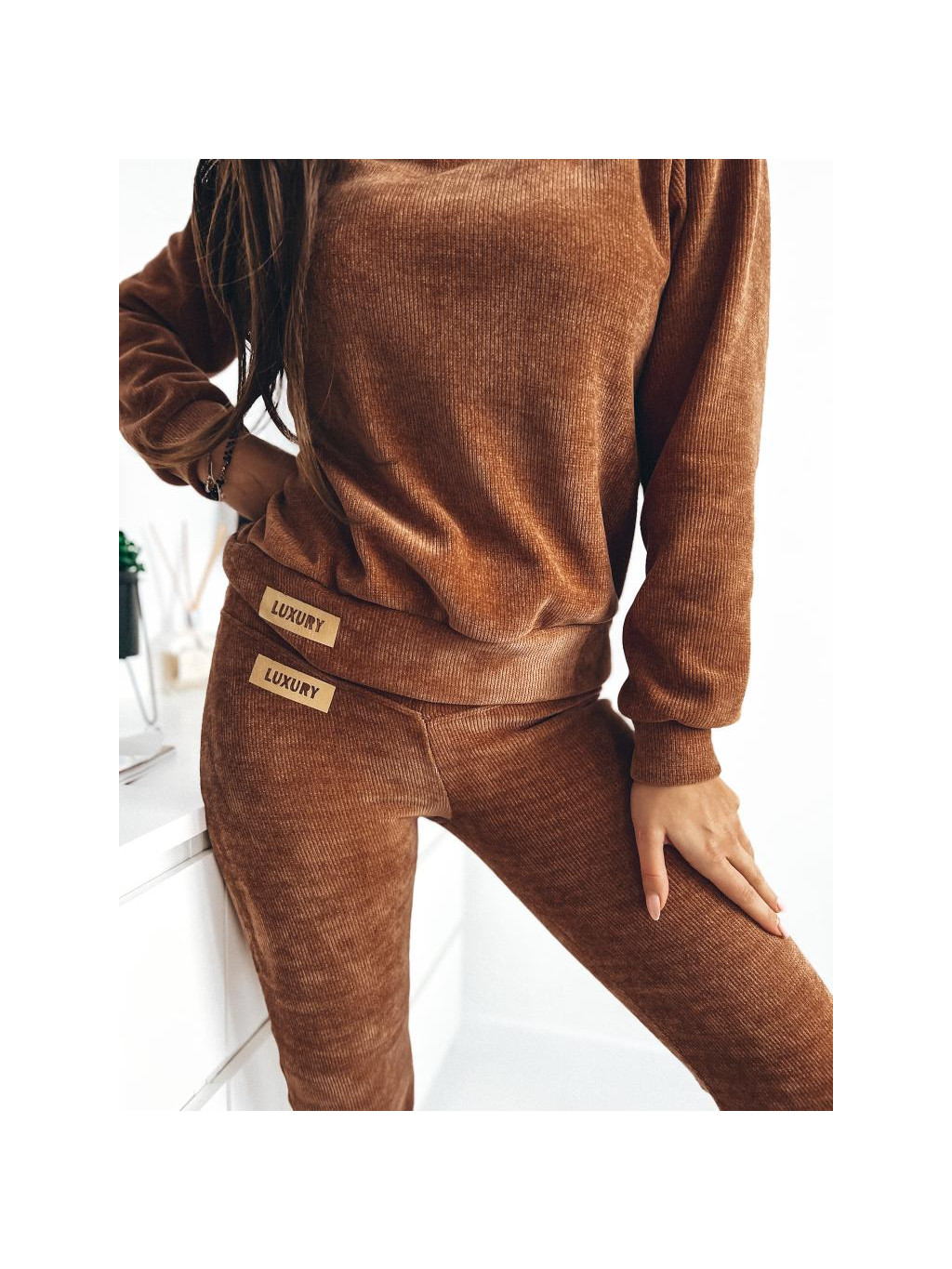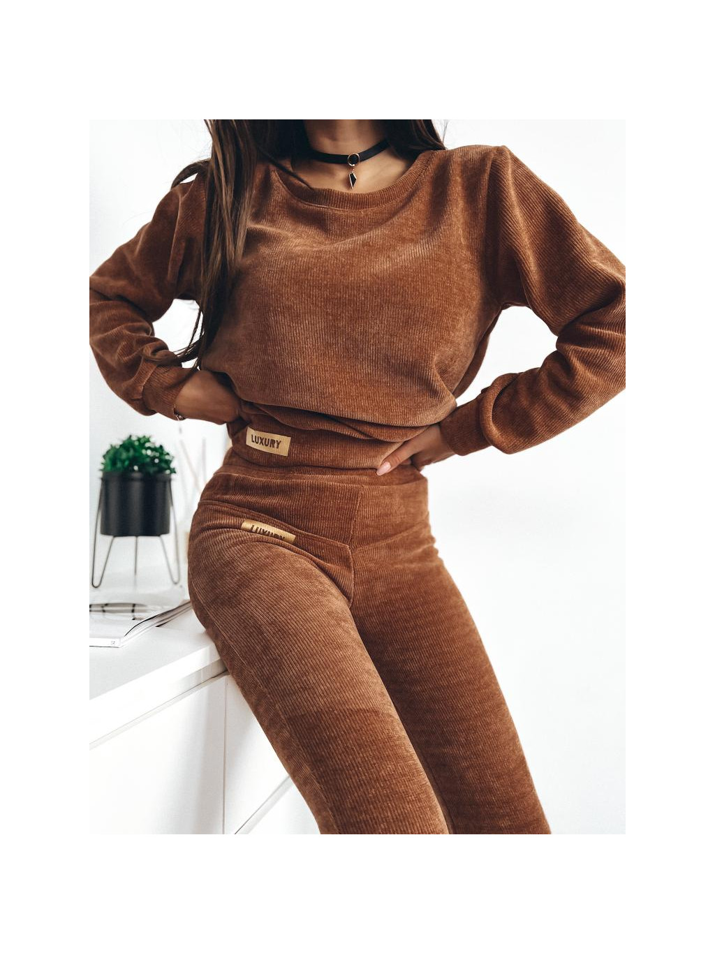 Mikina s okrúhlym výstrihom. Rukávy a spodná časť ukončená manžetou. Nohavice legínového strihu, s gumou v páse a zlatou potlačou.