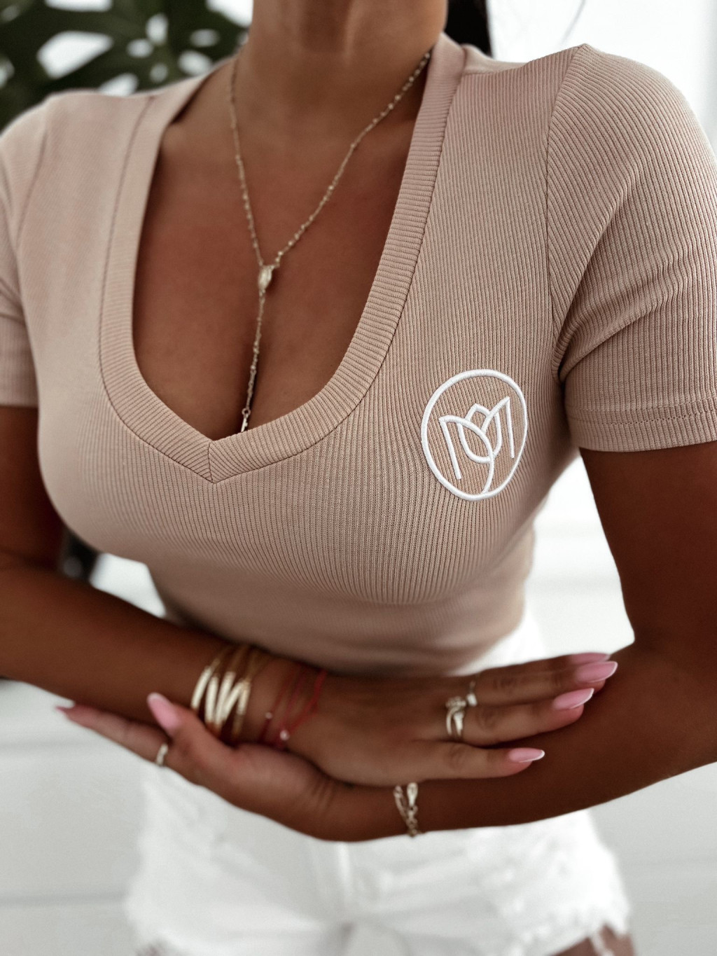 Top z kvalitnej Tureckej bavlny s V-čkovým výstrihom doplnený vyšívkou.