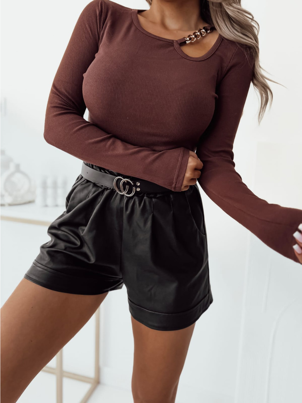 Elastický rebrovaný top s dlhým rukávom zdobený retiazkou.