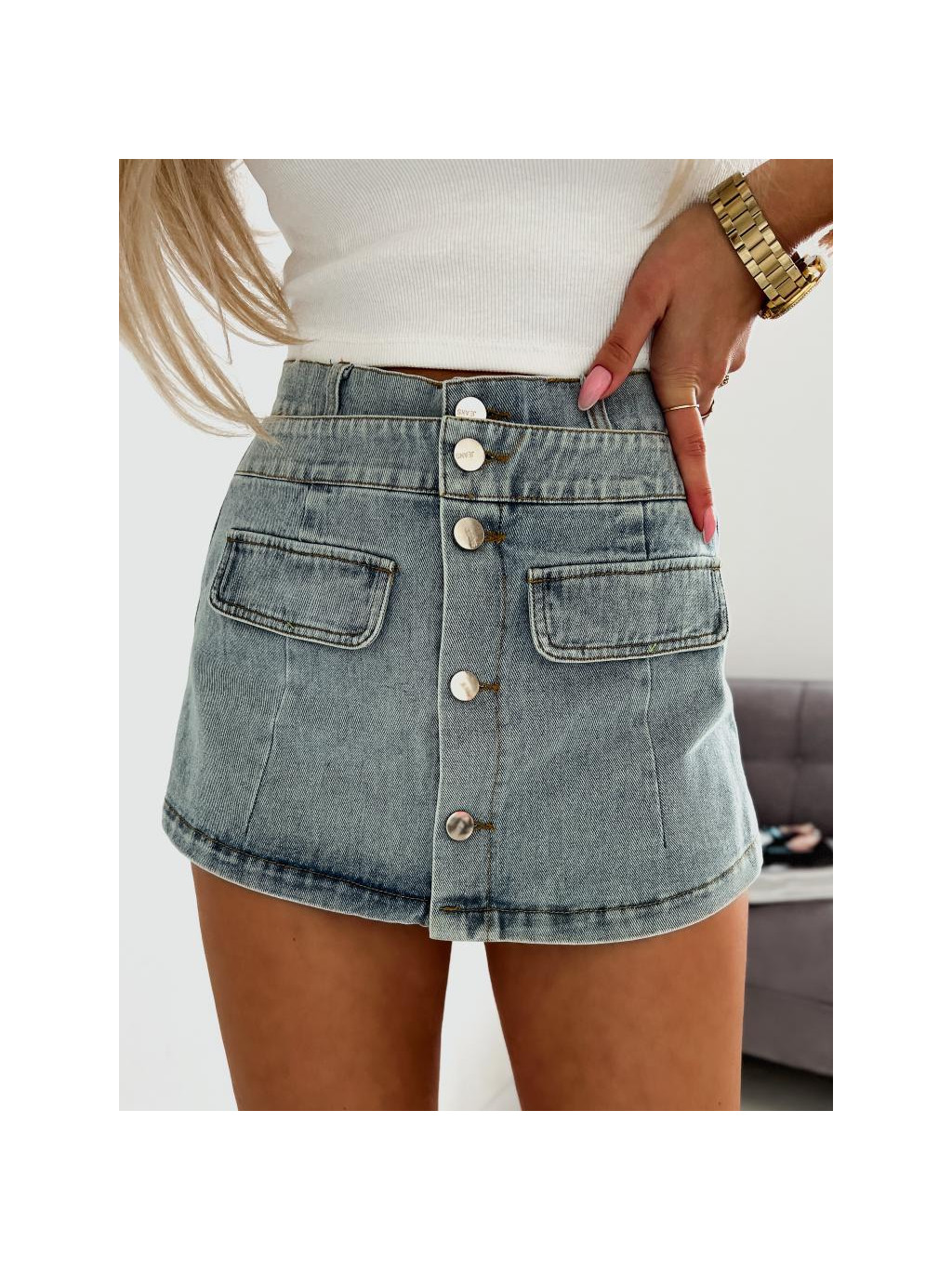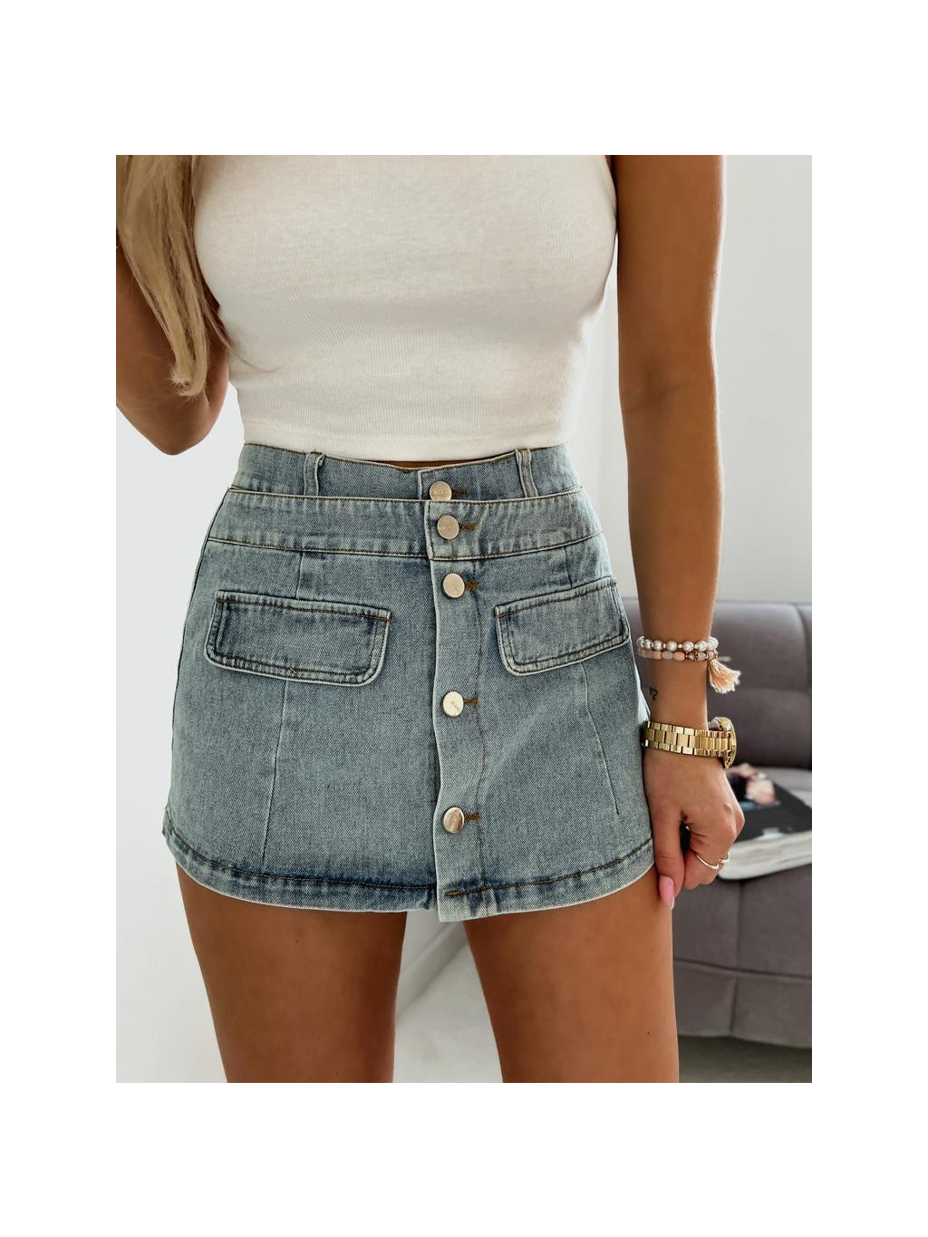 Kraťasy z pevnej rifľoviny, s prednými vreckami a zapínaním na gombíky. Kraťasy majú gumu v páse, ktorá sa prispôsobí postave.