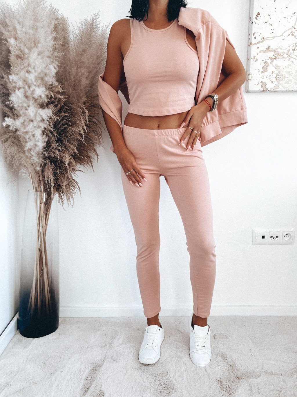 Pohodlná trojdielna tepláková súprava (crop top + mikina + legíny).