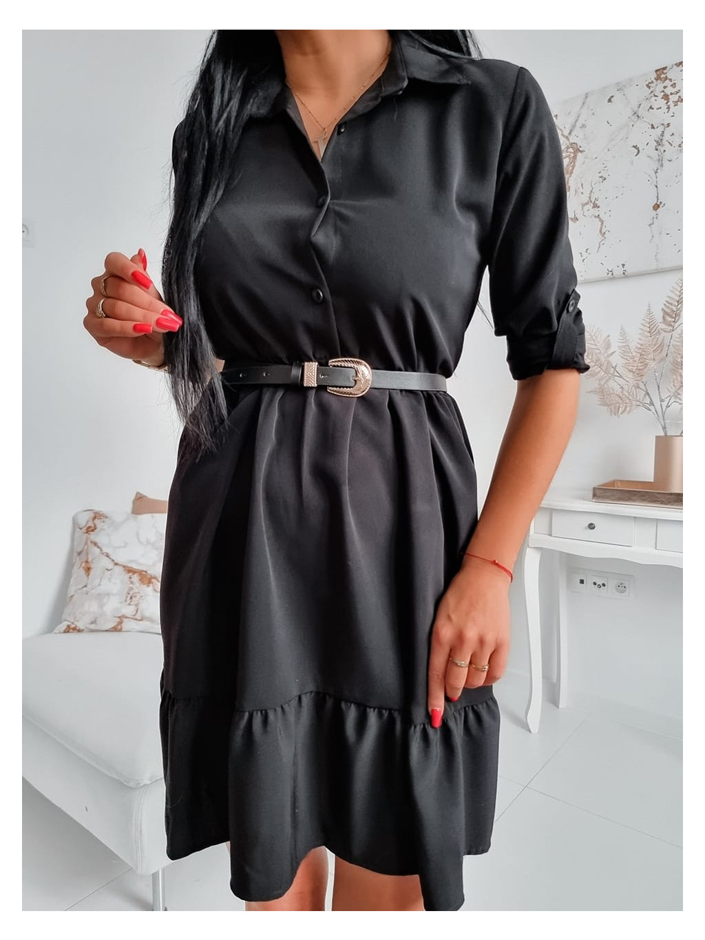Bavlnené šaty voľnejšieho strihu s jemne riaseným Á-čkovým spodným dielom. Rukávy so zapínaním na jeden gombík, ukončené manžetou.