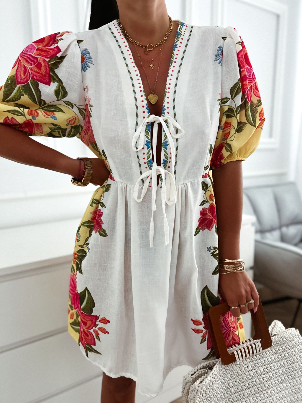 Šaty Á-čkového strihu a V-čkovým výstrihom s viazaním. Krátky puff rukáv ukončený gumičkou.
