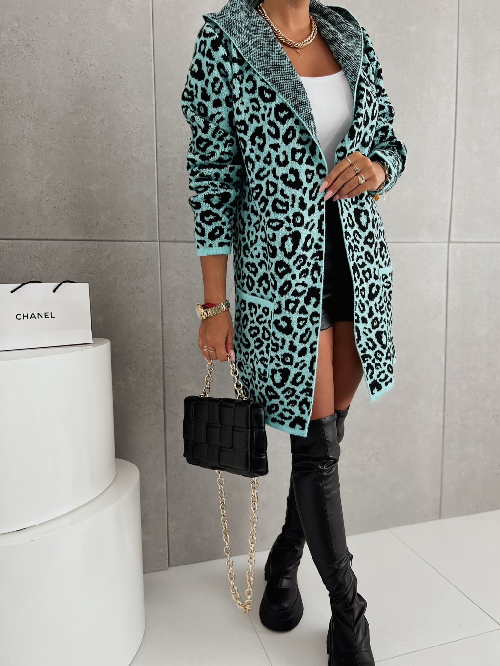 Vzorovaný leo svetríkový kardigán s kapucňou a dlhým rukávom.